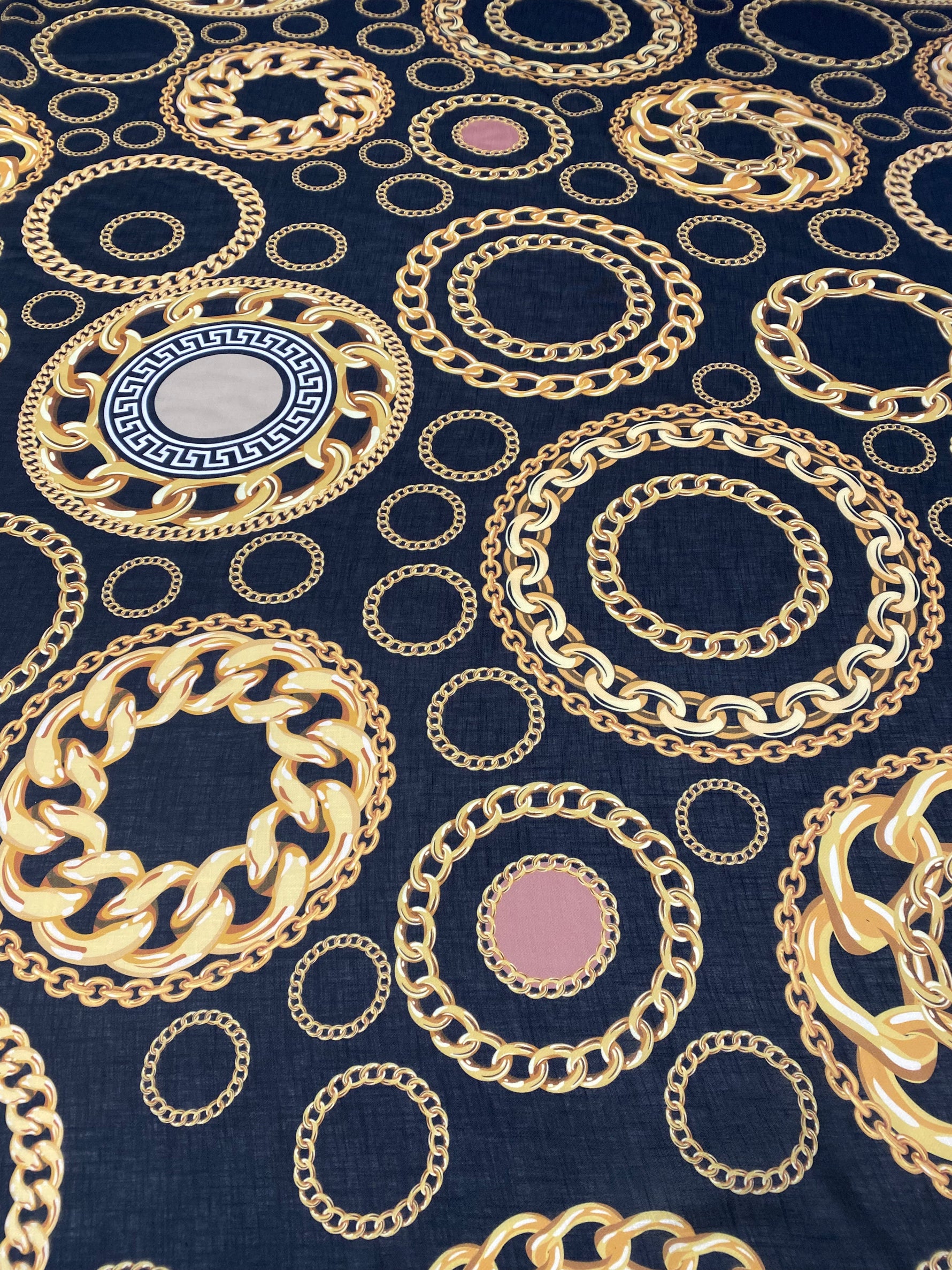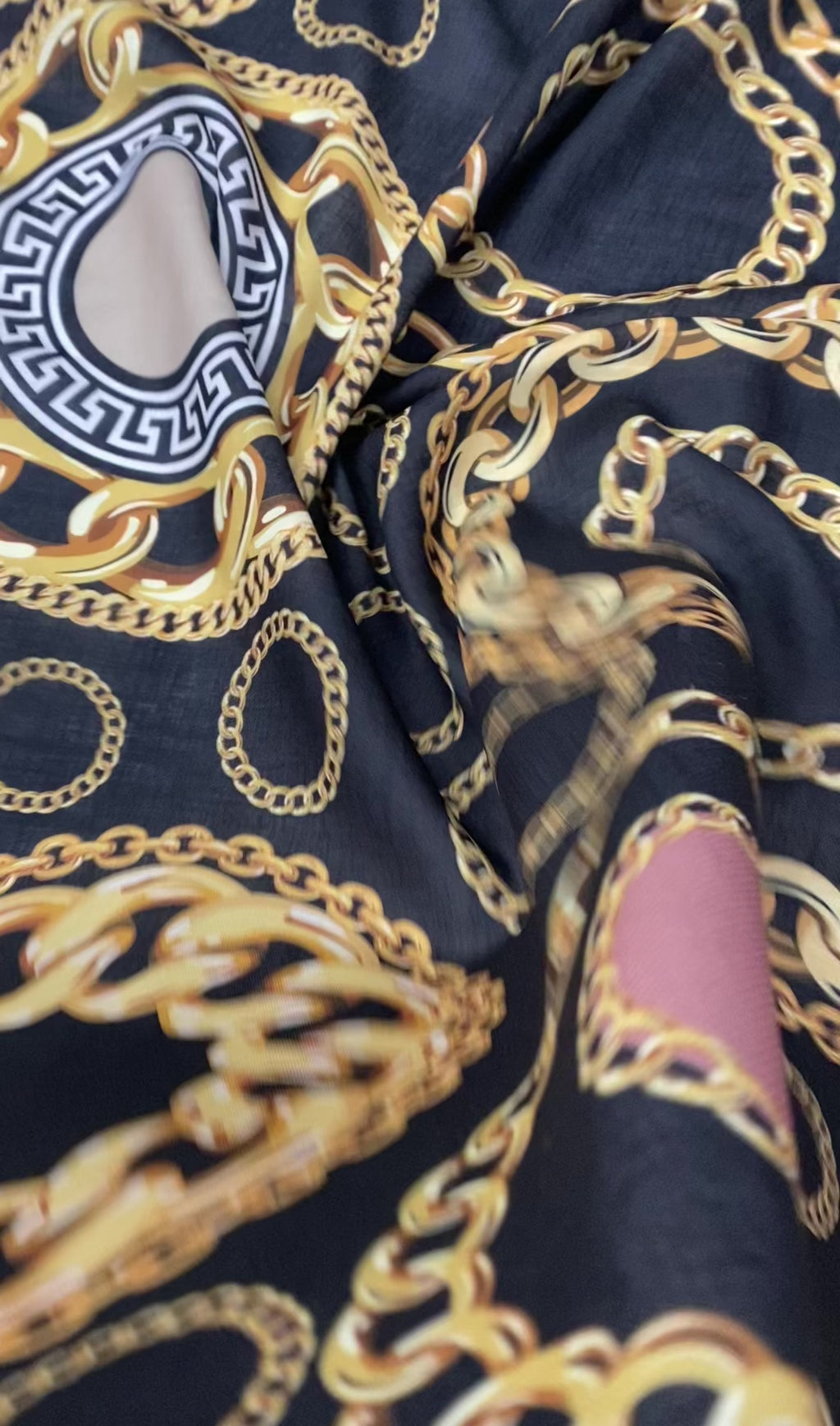 Black and Gold Baroque Pattern Luxury Chain Print Fabric by Metre – Elevate your projects with this statement print. Choose from soft cotton or satin blends, perfect for standout fashion, décor, and crafts.