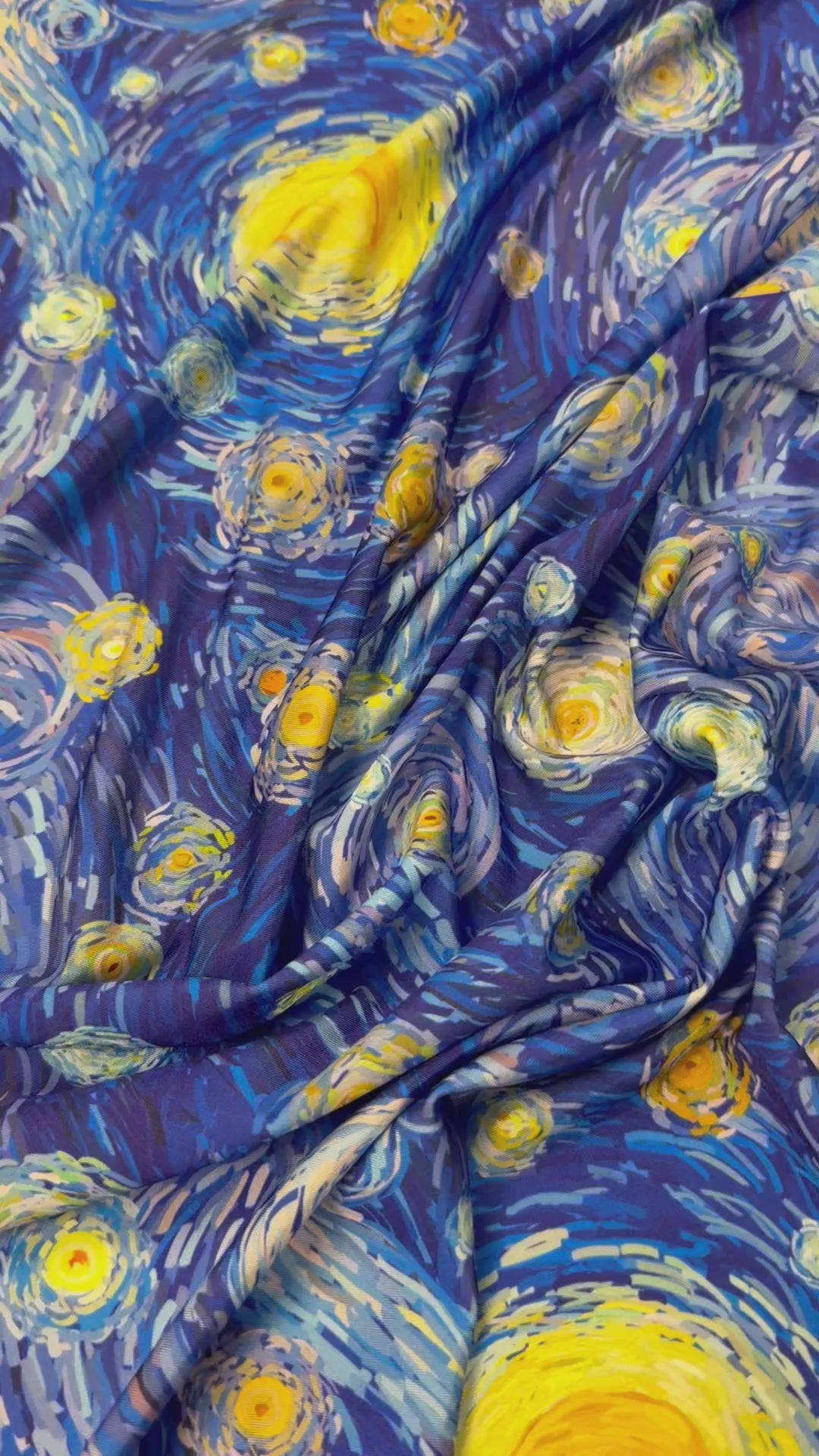 Soft stretch spandex fabric featuring a vibrant starry night-style print in deep blues and yellows. Perfect for dresses, tops, activewear and creative sewing projects. Sold by the metre.