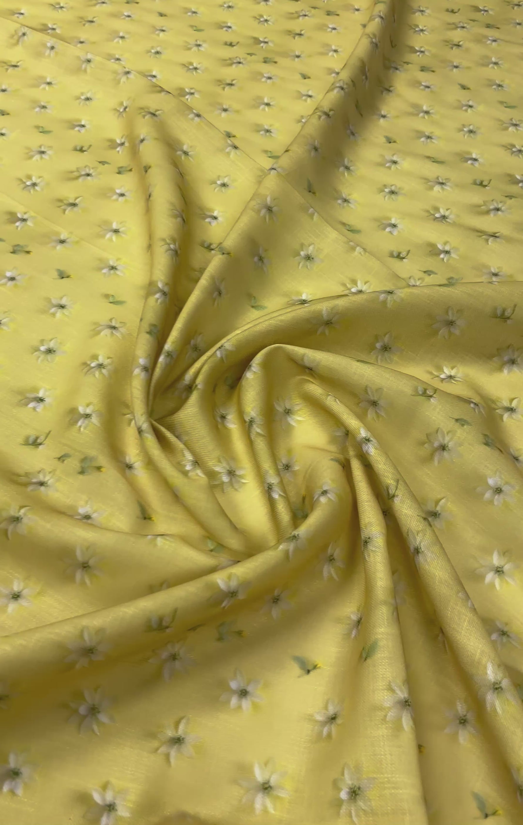 Lightweight linen fabric with a delicate small floral print on a soft yellow base. Breathable and natural, ideal for summer dresses, blouses, skirts, shirts and relaxed sewing projects. Sold by the metre.
