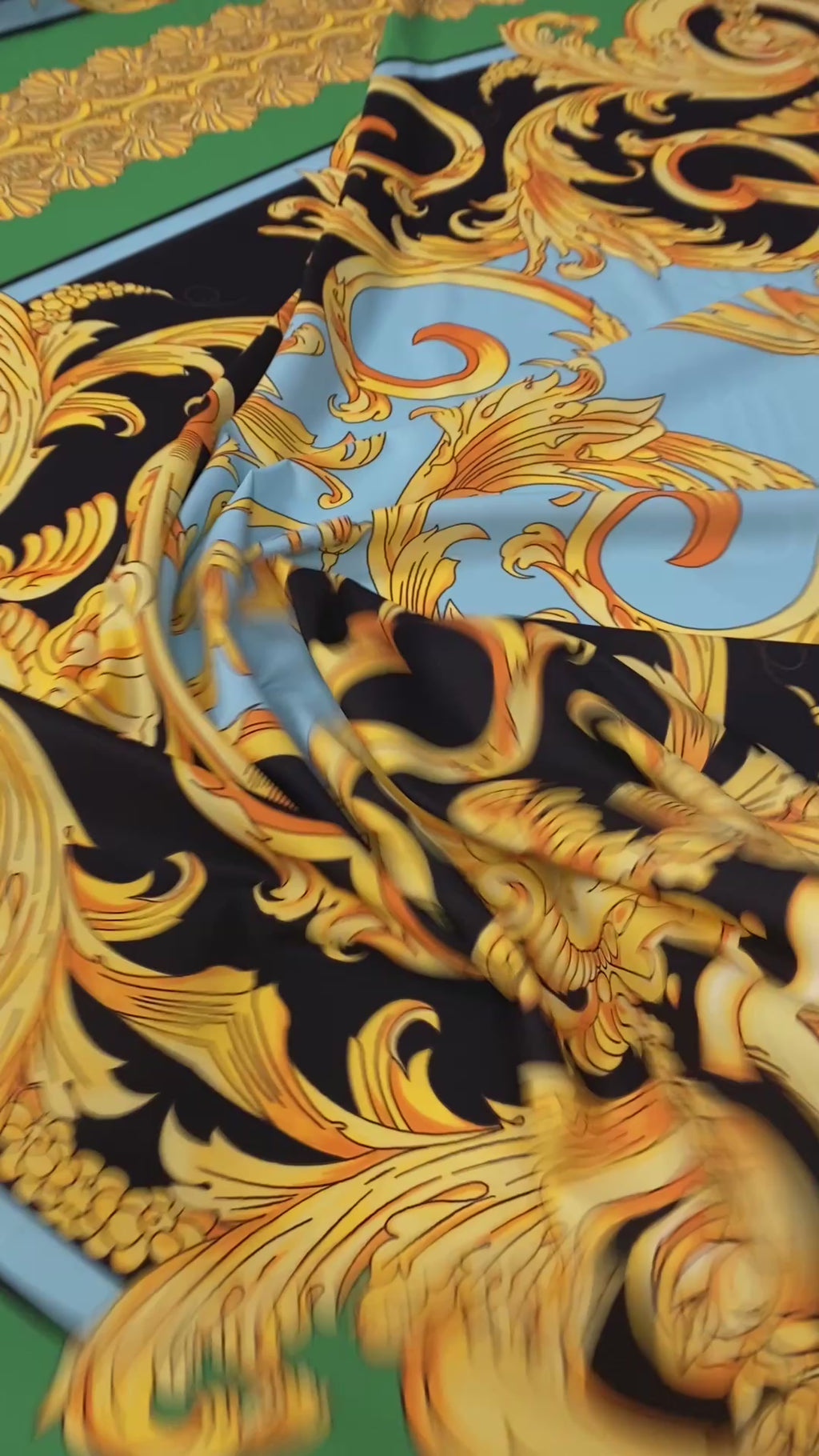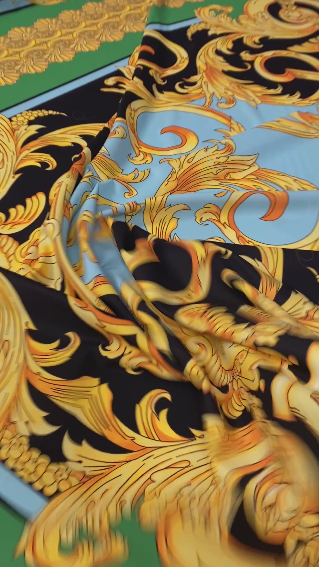 Luxury Baroque Crepe Fabric by the Metre – Black Gold & Green Ornate