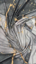 Soft stretch spandex fabric featuring a luxurious marble-effect print in grey, black and gold tones. Ideal for dresses, tops, activewear and stylish DIY sewing projects. Sold by the metre.