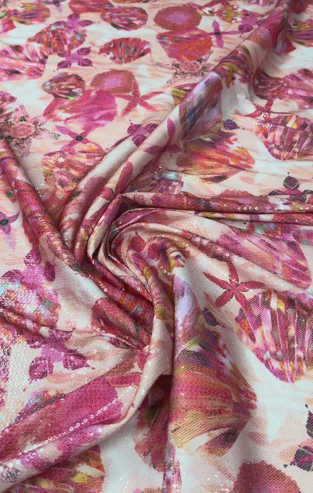 Vibrant pink floral sequin fabric with a soft drape and subtle sparkle. Ideal for summer dresses, beachwear, kids’ outfits and creative sewing projects.