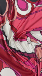 Soft stretch spandex fabric with vibrant pink-red retro abstract print. Perfect for dresses, tops, activewear and creative sewing projects with smooth drape. Sold by the metre.