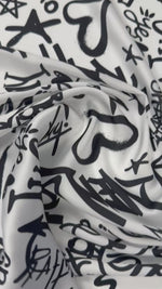 Smooth satin fabric featuring bold black graffiti motifs on a crisp white base. Lightweight, glossy and ideal for dresses, shirts, skirts and creative sewing projects. Sold by the metre.