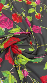 Elegant crepe fabric with vibrant red and pink rose print on a smooth black base. Lightweight, flowing and ideal for dresses, blouses and skirts. Sold by the metre.