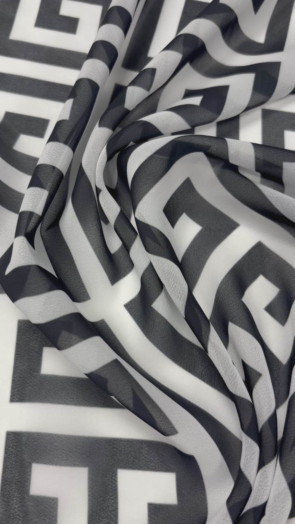 Lightweight chiffon with a bold black and white Greek key pattern, offering a soft drape for blouses, dresses and scarves. Perfect for elegant fashion pieces. Sold by the Metre.