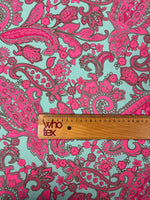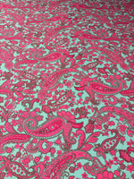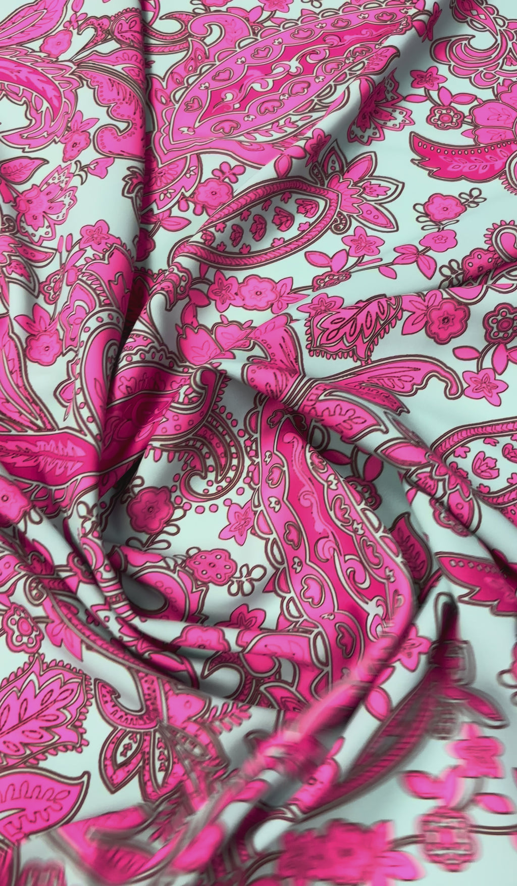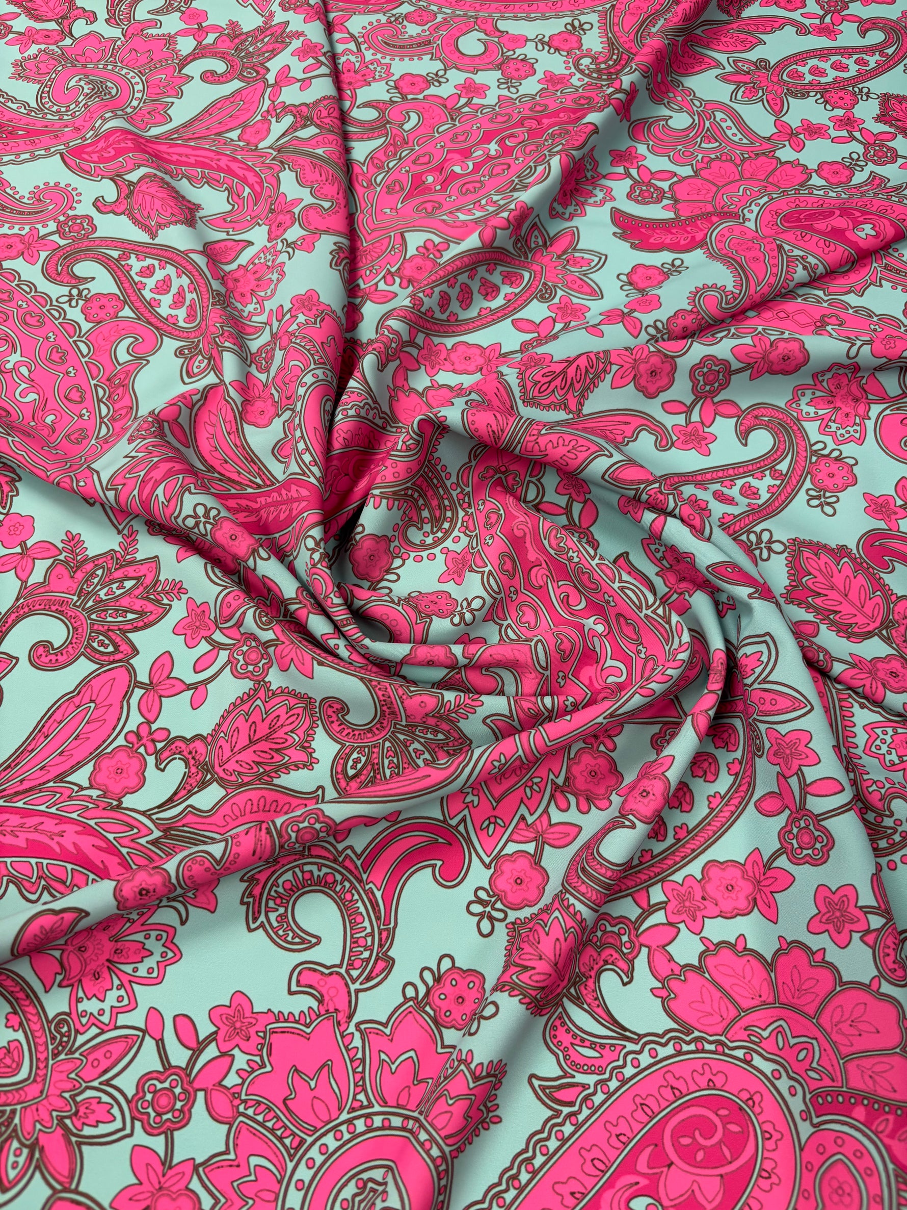 Soft crepe fabric featuring an elegant paisley-inspired pattern in vibrant pink tones. Ideal for dresses, blouses and creative sewing projects. Smooth handle, lightweight comfort and graceful drape. Sold by the Metre.