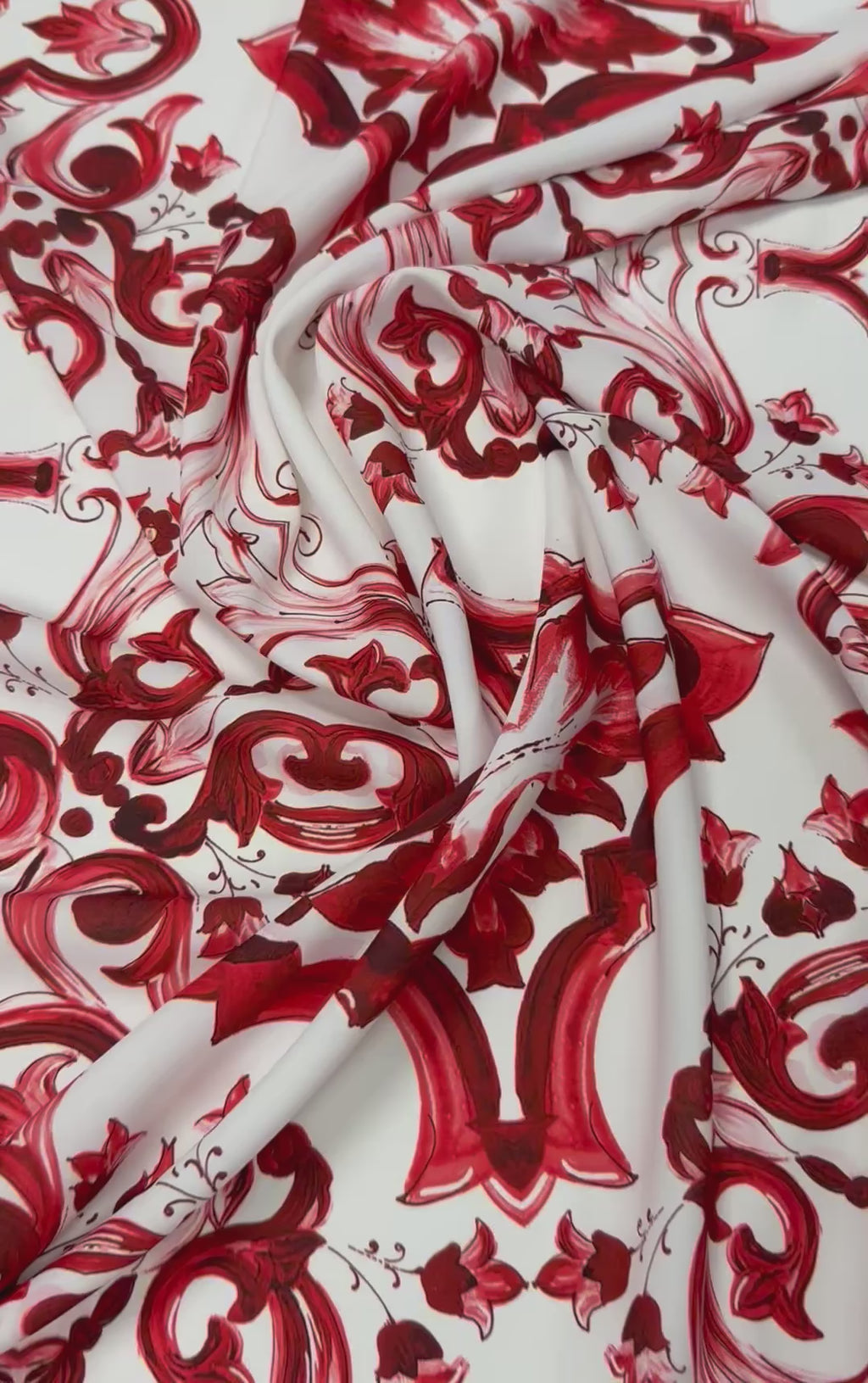 Lightweight crepe fabric with a rich red baroque tile pattern, perfect for dresses, blouses and statement garments with a soft flowing drape. Sold by the Metre.