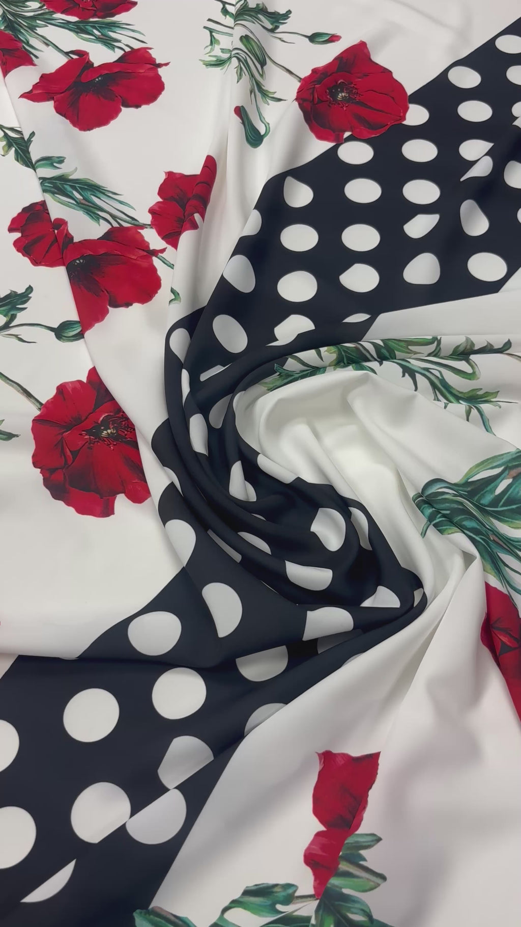 Soft drape crepe fabric with bold red roses and classic polka dots. Ideal for dresses, blouses, skirts and stylish handmade fashion. Sold by the metre.