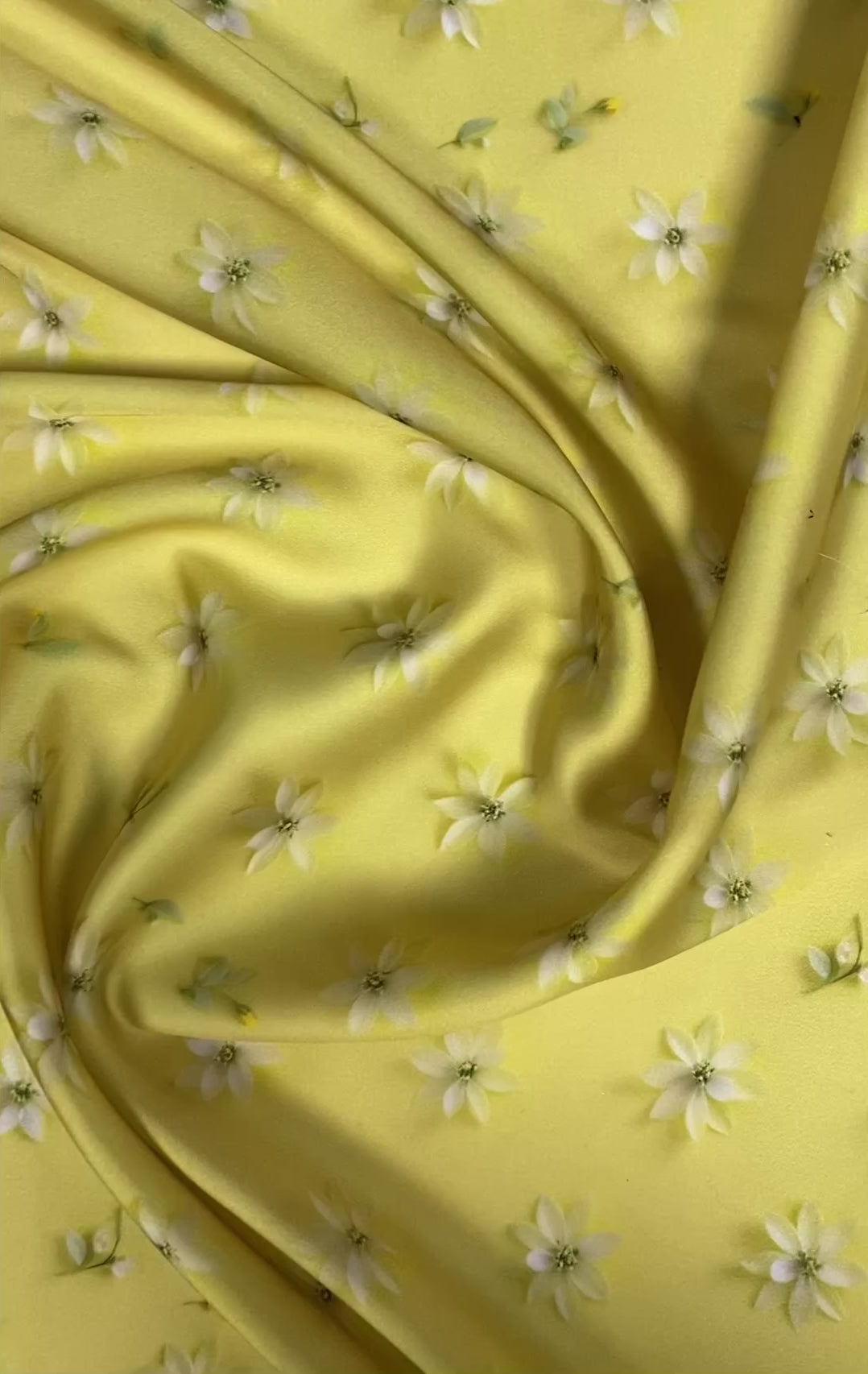Bright yellow fabric with delicate 3D white daisies. Perfect for spring dresses, blouses, or elegant decorative projects.