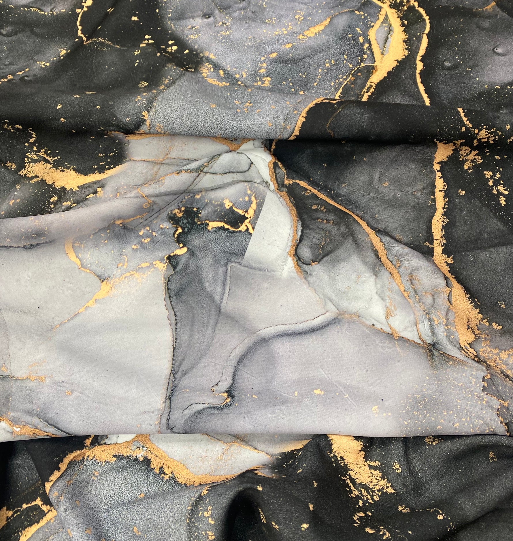 Gray Tie Dye Fabric with Gold Accents by the Metre – Elegant grey tie dye with striking gold details. Available in a range of fabric types to suit your next project.