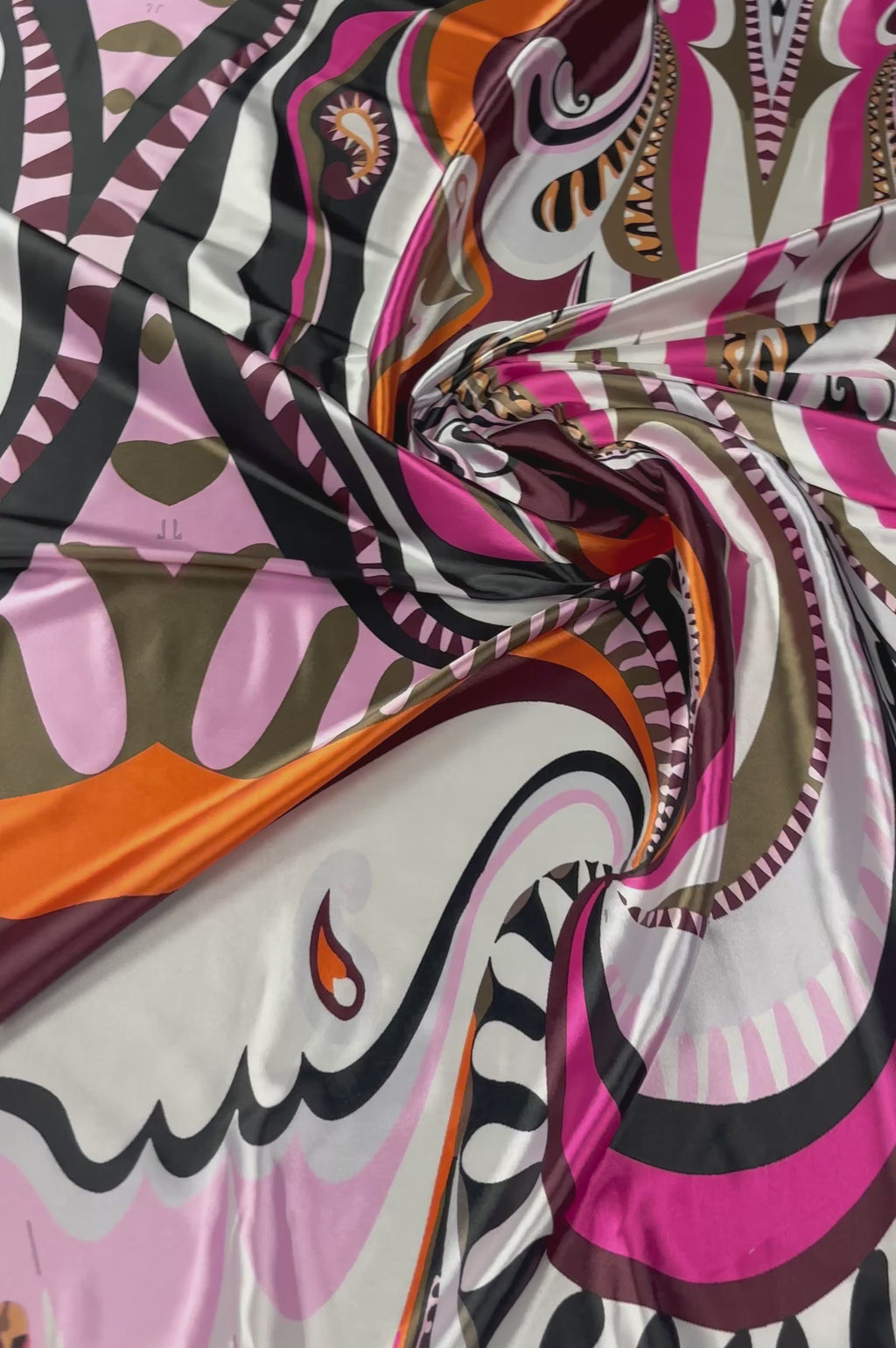Stretch satin with bold abstract swirls and a glossy finish. Ideal for fitted dresses, skirts, tops and eye-catching fashion designs. Sold by the metre.