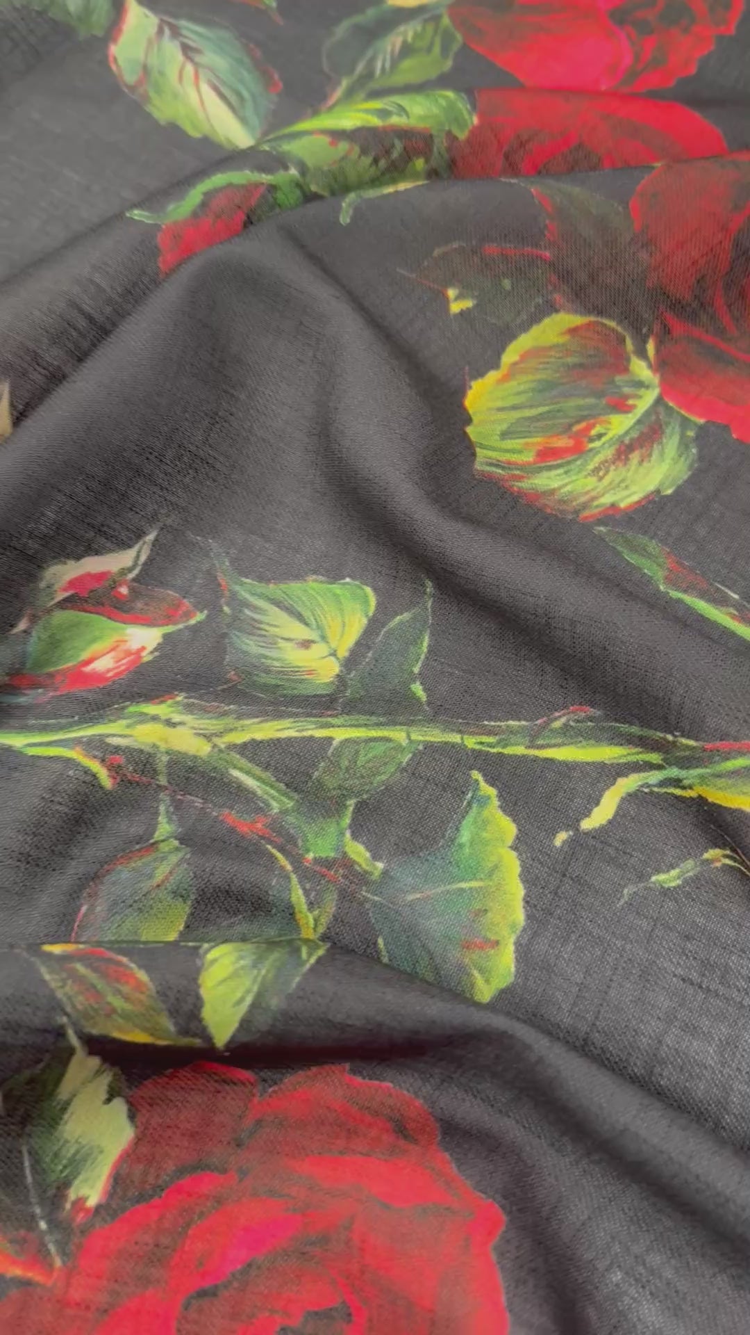 Soft and breathable black linen fabric with vibrant red rose prints. Ideal for dresses, blouses, skirts, crafts and elegant sewing projects with a natural feel.