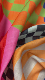 Eye-catching linen fabric with vibrant geometric shapes and colourful blocks, ideal for statement dresses, creative tailoring and modern home décor projects. Sold by the Metre