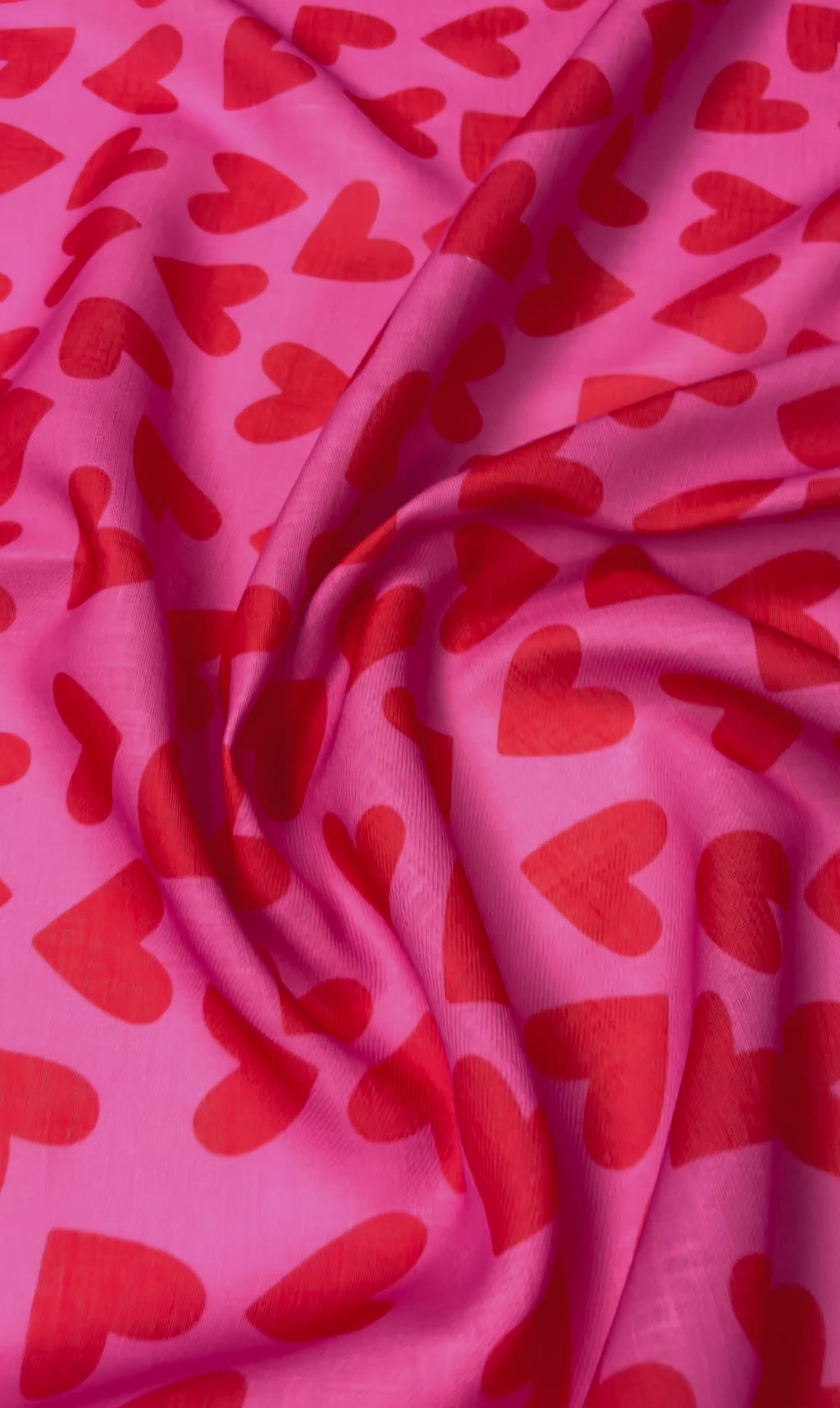 Soft linen fabric featuring an all-over red heart print on a pink base, perfect for dresses, tops, home décor and craft projects with a playful romantic feel. Sold by the Metre