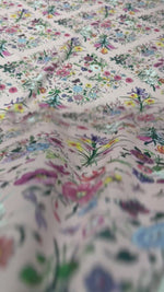 Lightwight pink floral linen fabric with vibrant botanical prints. Perfect for dresses, blouses, home decor crafts and summer sesini projects with a soft, breathable feel. Sold by the Metre.