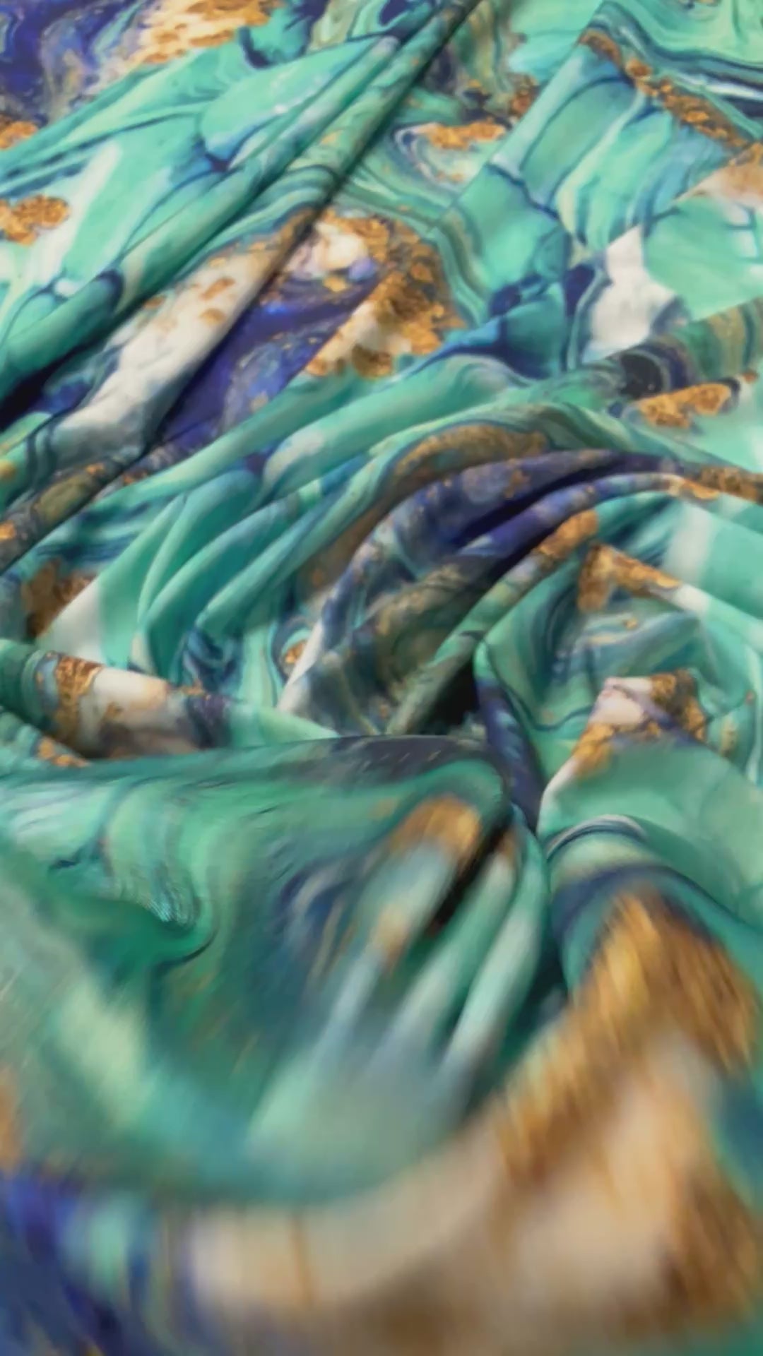 High quality spandex fabric with a fluid marble effect print in blue and green tones. Soft, stretchy and ideal for dresses, tops, activewear and creative sewing projects. Sold by the metre.