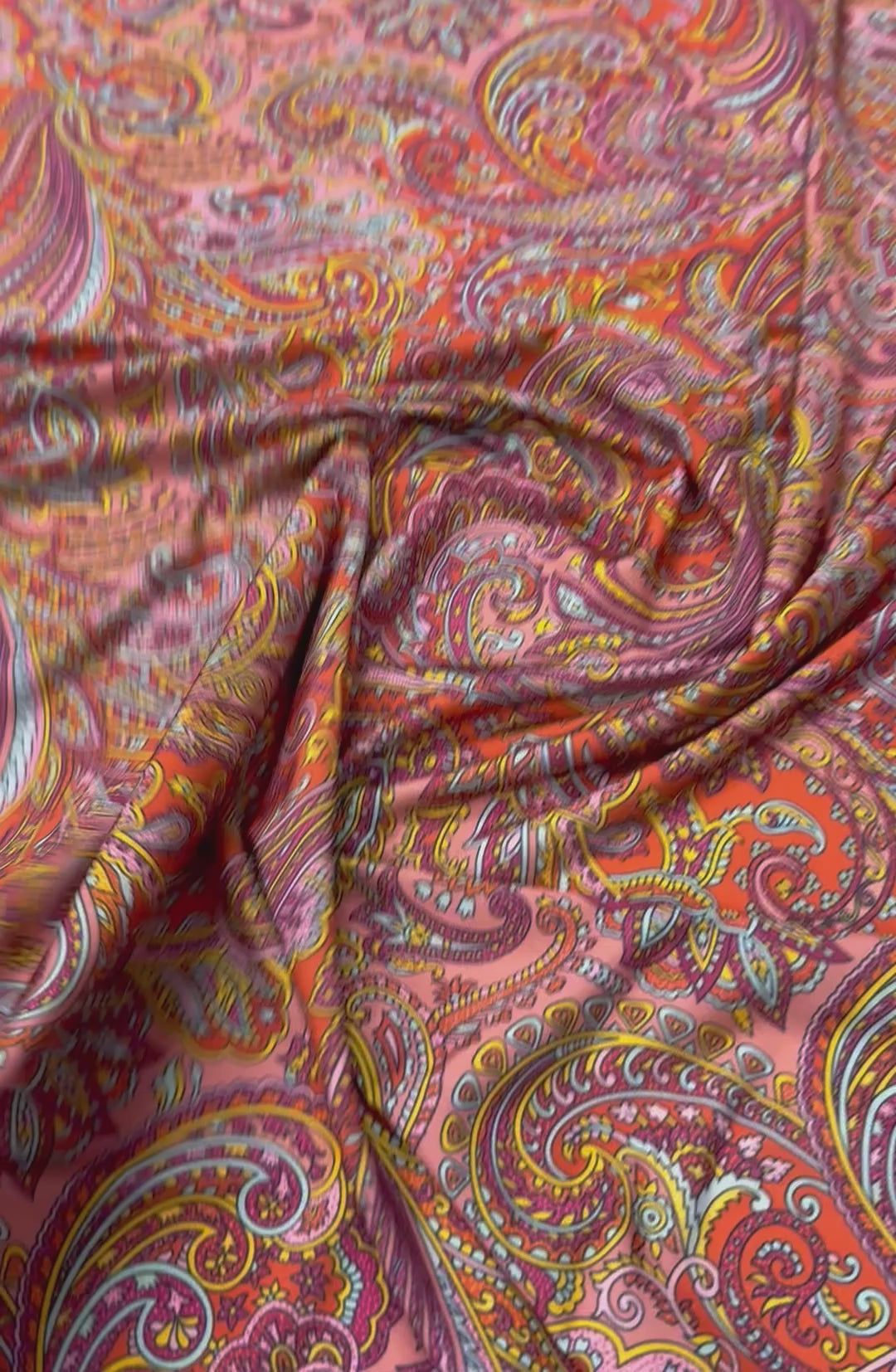 Soft and flexible spandex fabric featuring an all-over paisley print in rich warm tones. Perfect for dresses, skirts, tops, leggings and comfortable statement garments. Sold by the metre.
