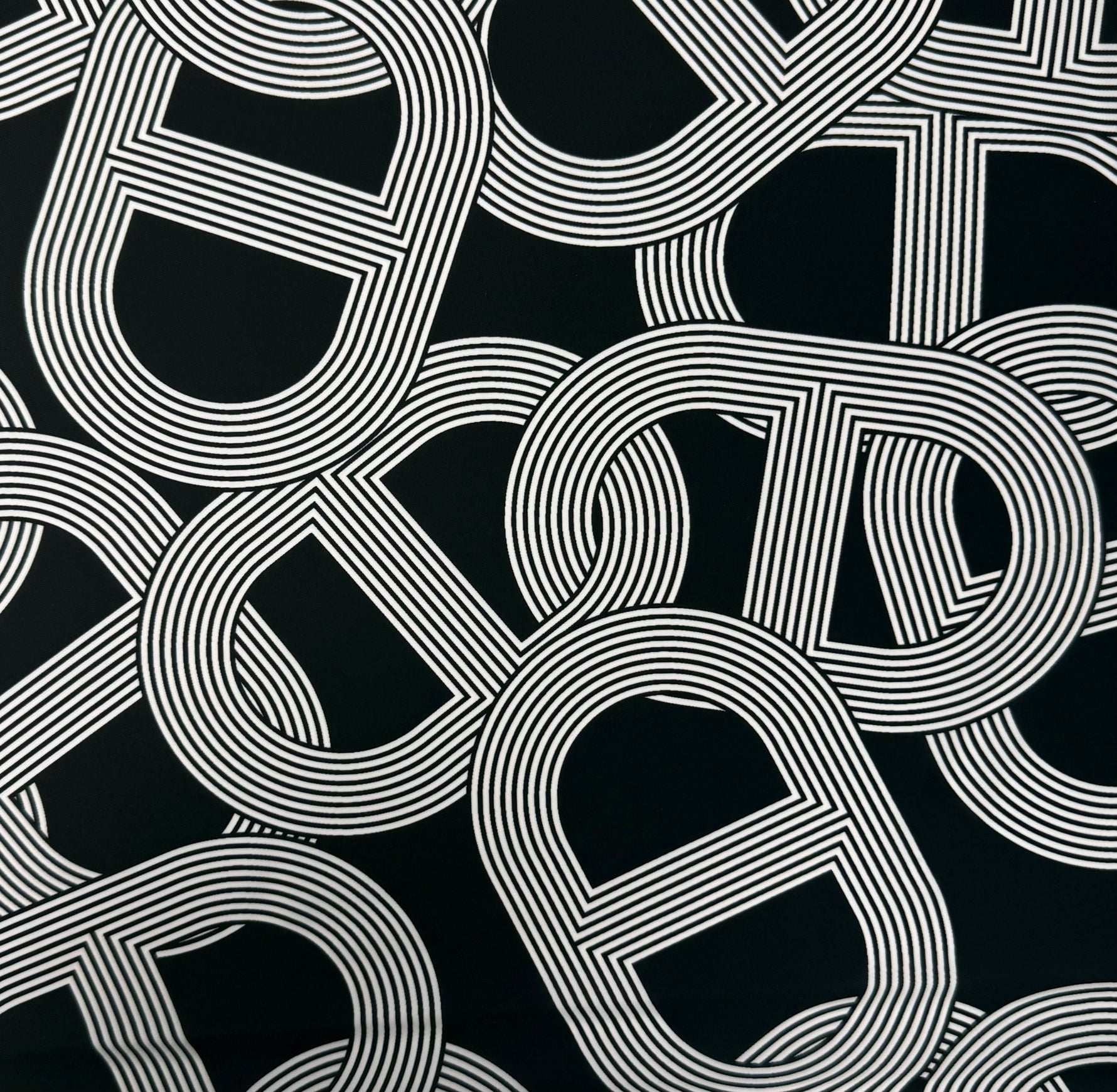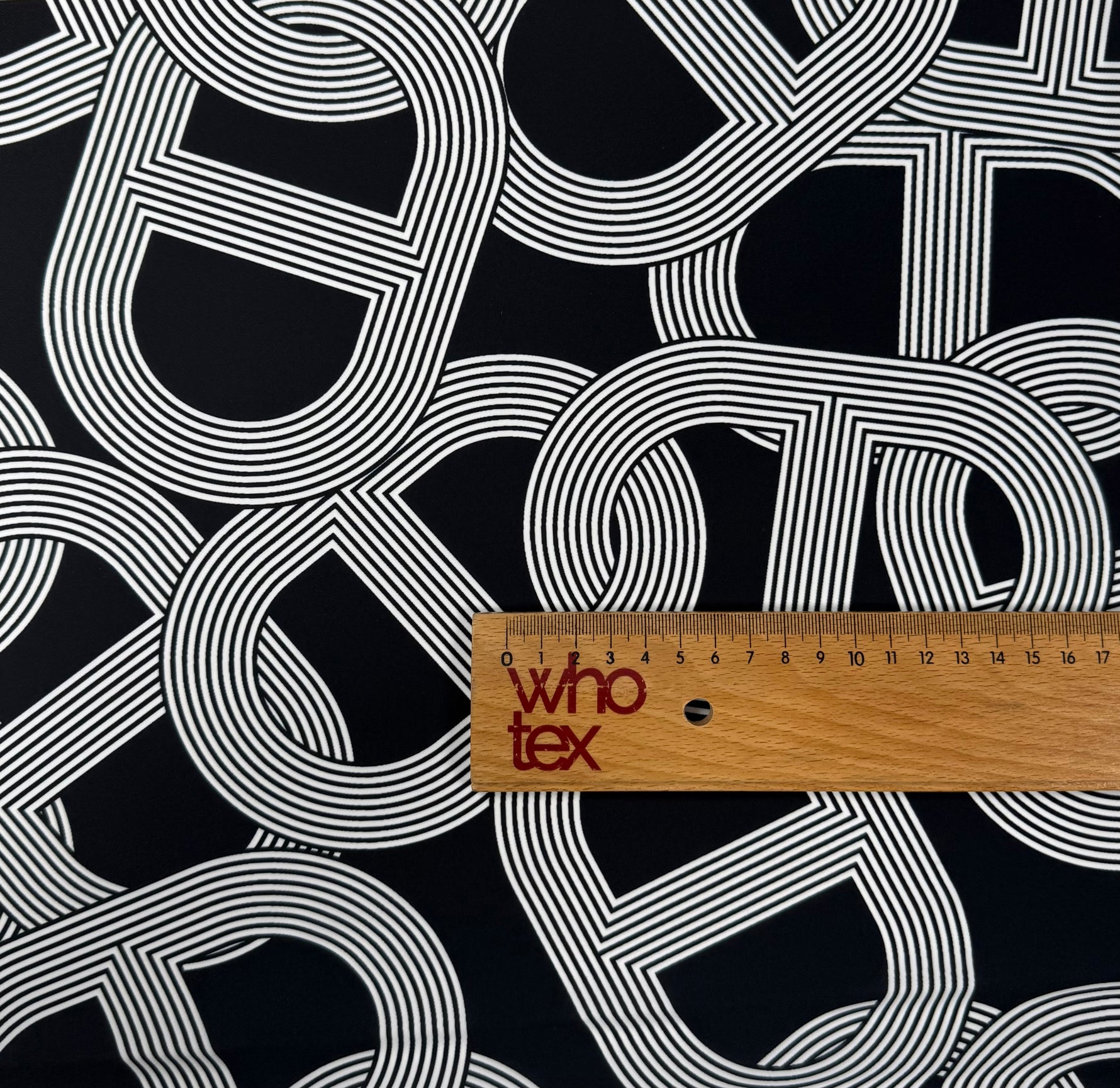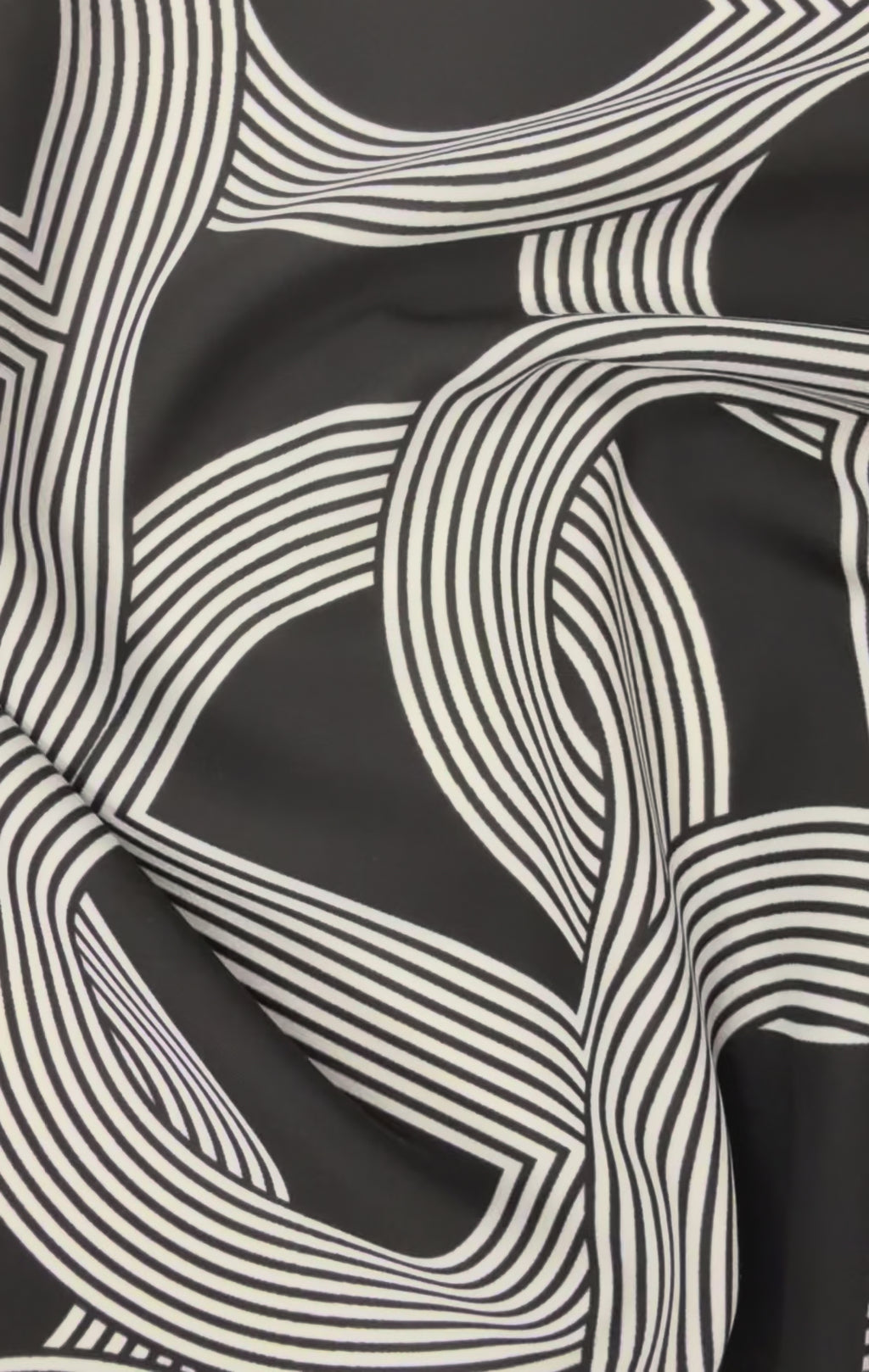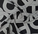 Elegant black fabric featuring a bold geometric line pattern in contrasting tones. Ideal for dresses, tops, skirts and modern fashion designs. Sold by the Metre.