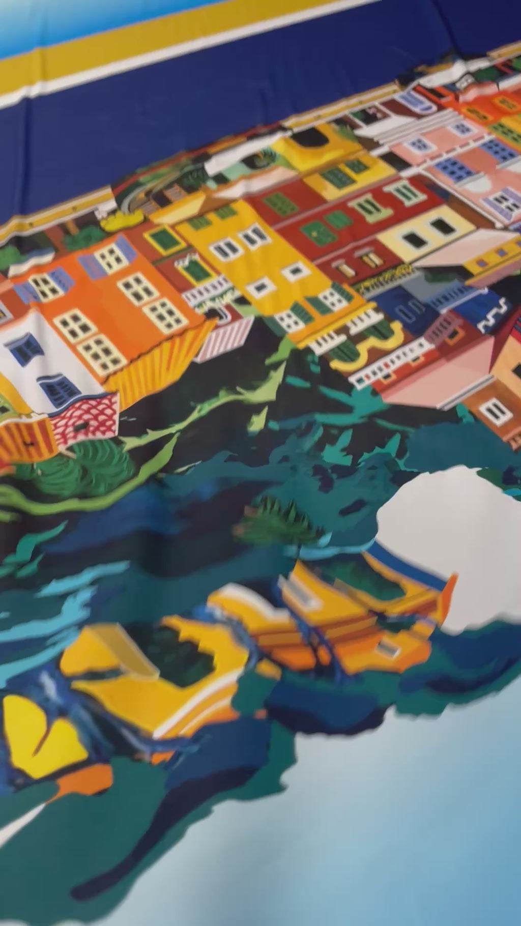 Shop crepe fabric with colourful Mediterranean village print by the metre. Perfect for dresses, blouses, and crafts. Premium quality, vibrant design.