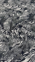 Bold abstract animal print blending zebra-inspired stripes with textured detailing. Ideal for statement dresses, tops and fashion pieces with a modern edge. Sold by the Metre.