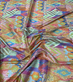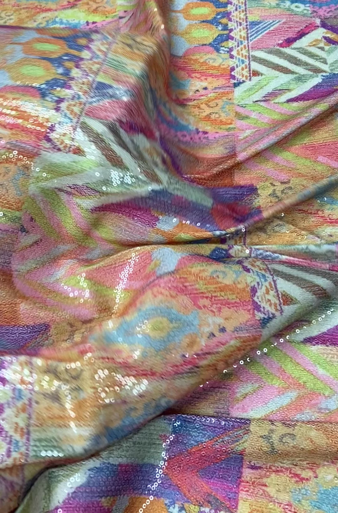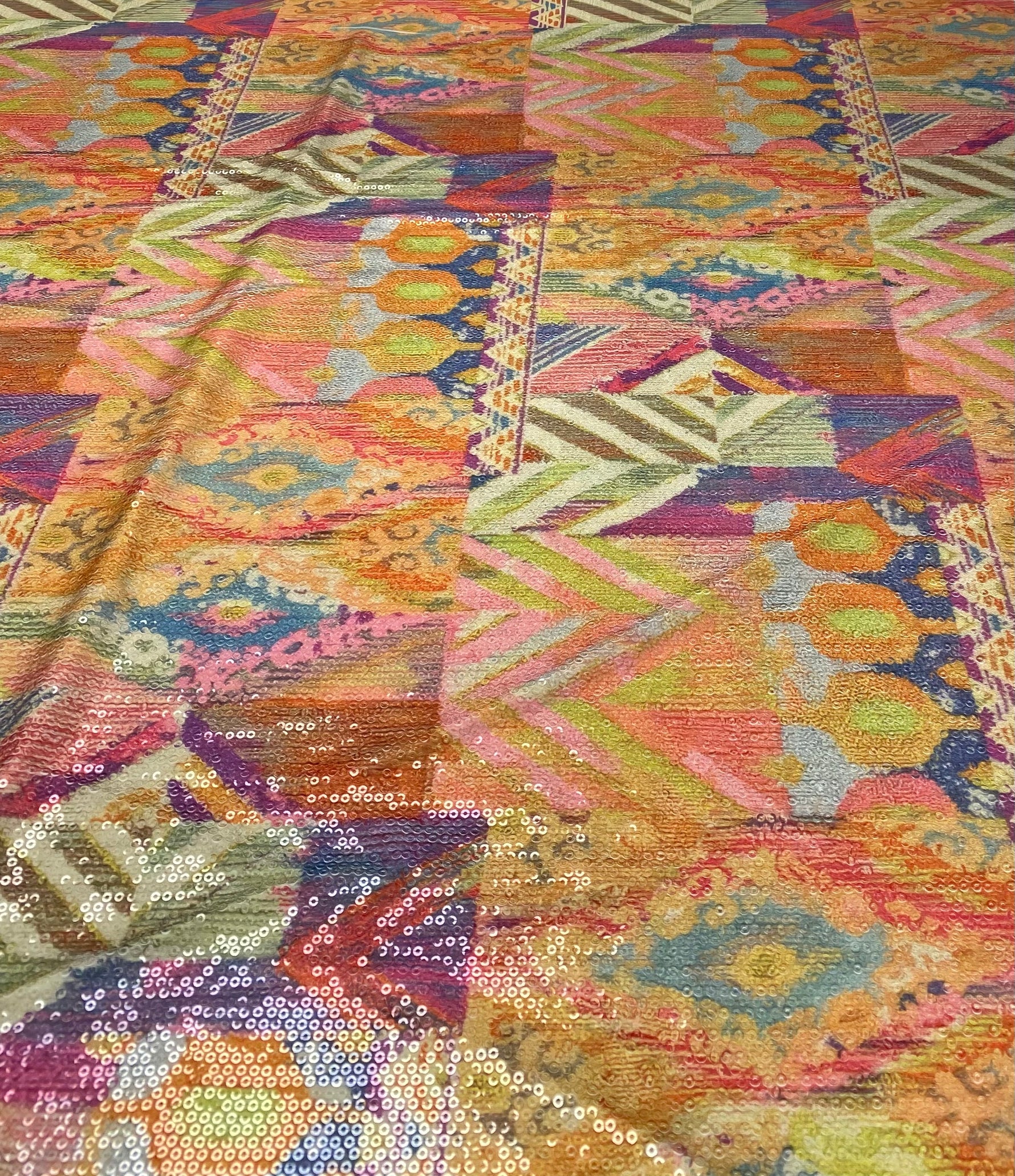 Unit price perVibrant multicolour patchwork sequin fabric featuring geometric and ornamental patterns. Perfect for statement dresses, stagewear and eye-catching fashion pieces. Sold by the Metre.