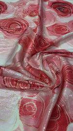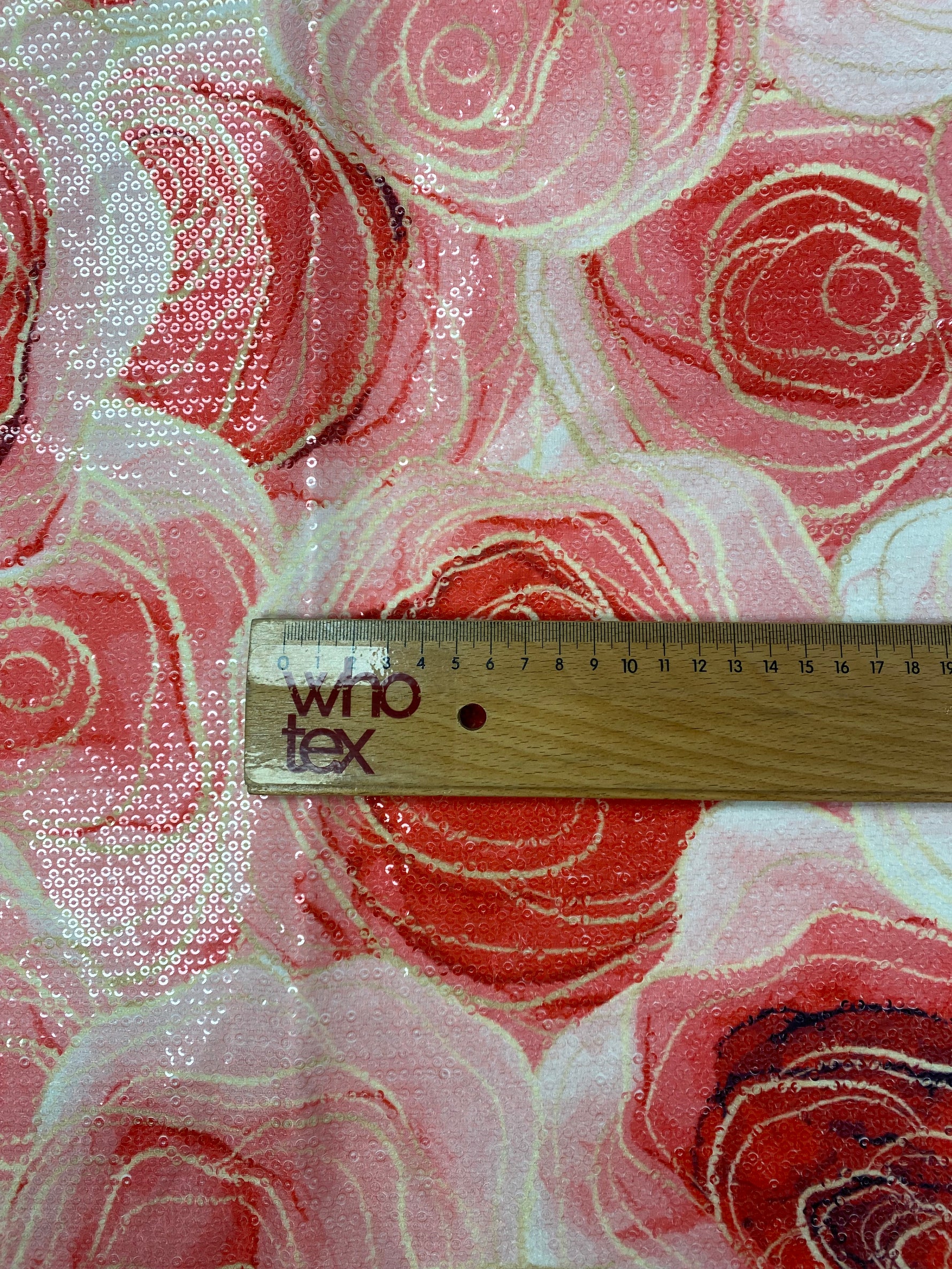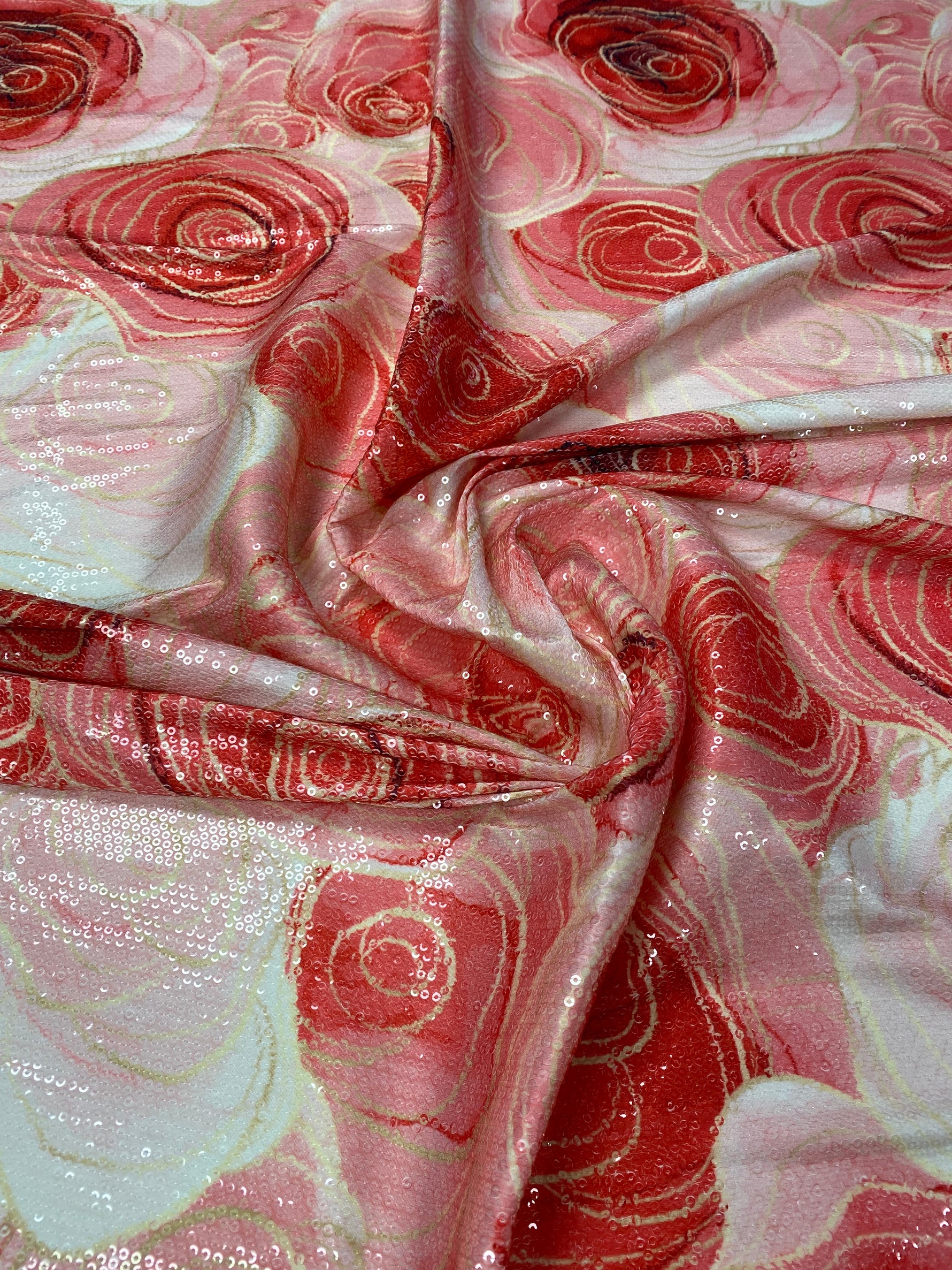 Striking red and pink abstract swirl sequin fabric with a glossy finish. Perfect for statement dresses, eveningwear and eye-catching fashion designs. Sold by the Metre.