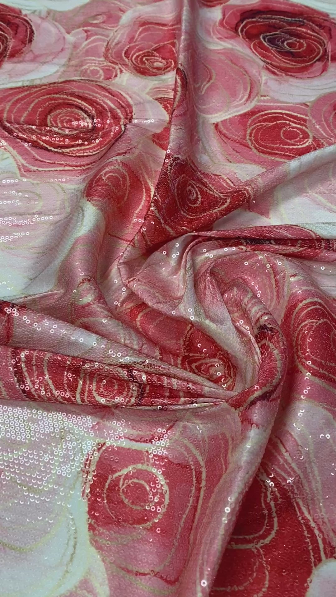 Unit price perStriking red and pink abstract swirl sequin fabric with a glossy finish. Perfect for statement dresses, eveningwear and eye-catching fashion designs. Sold by the Metre.