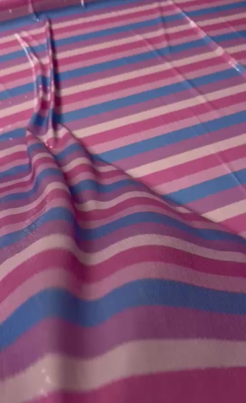 Playful pink and blue striped fabric with subtle sequins and a soft drape. Ideal for summer dresses, tops, kids’ outfits and fun creative sewing projects.
