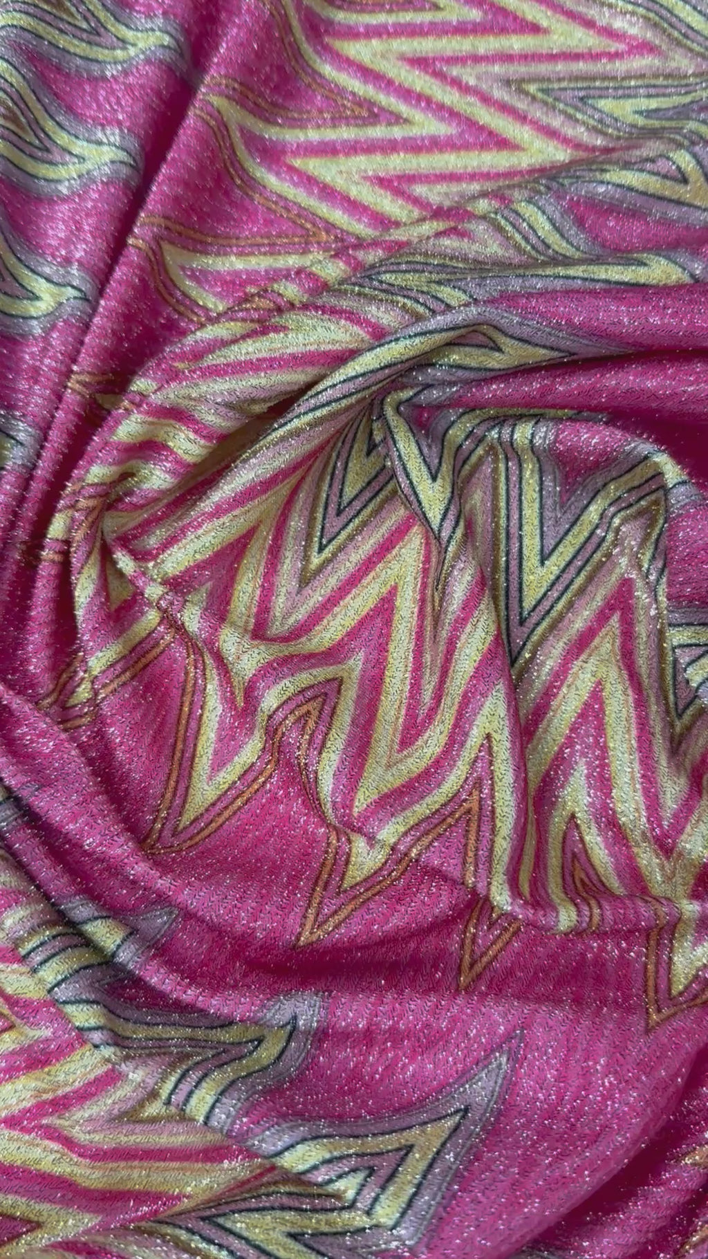 Our pink zigzag fabric offers vibrant style and superior comfort, making it the perfect choice for activewear and dancewear that demands both performance and eye-catching appeal. This premium pink zigzag fabric is a lurex knit fabric woven with subtle gold metallic threads in a soft, 4-way stretch fabric that supports unrestricted movement and lasting comfort. Measuring 150 cm wide, this pink chevron fabric provides ample coverage and versatility for leotards, dresses, leggings, swimwear, and costumes. Crafted with advanced knit spandex textile technology, this patterned stretch fabric blends durability with elasticity to maintain garment shape while adapting seamlessly to your body’s movements. Tested for colorfastness, it guarantees lasting vibrancy even after multiple washes. Whotex Online Fabric Store stands behind this glitter lurex fabric with quality assurance and customer satisfaction guarantees, trusted worldwide by designers for its perfect balance of style and function.