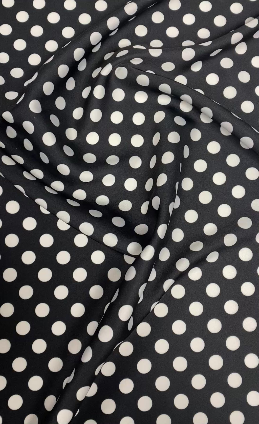 Timeless black and white polka dot fabric, ideal for dresses, blouses, and crafts. Sold by the metre with no minimum order.