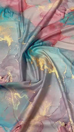 Soft pastel marble effect fabric with gold vein highlights. Perfect for dresses, blouses, crafts, or elegant home décor with a modern artistic touch.