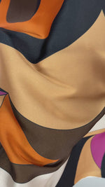 Bold retro swirl pattern in orange, brown, and pink tones. 70s-inspired fabric perfect for dresses and home decor.