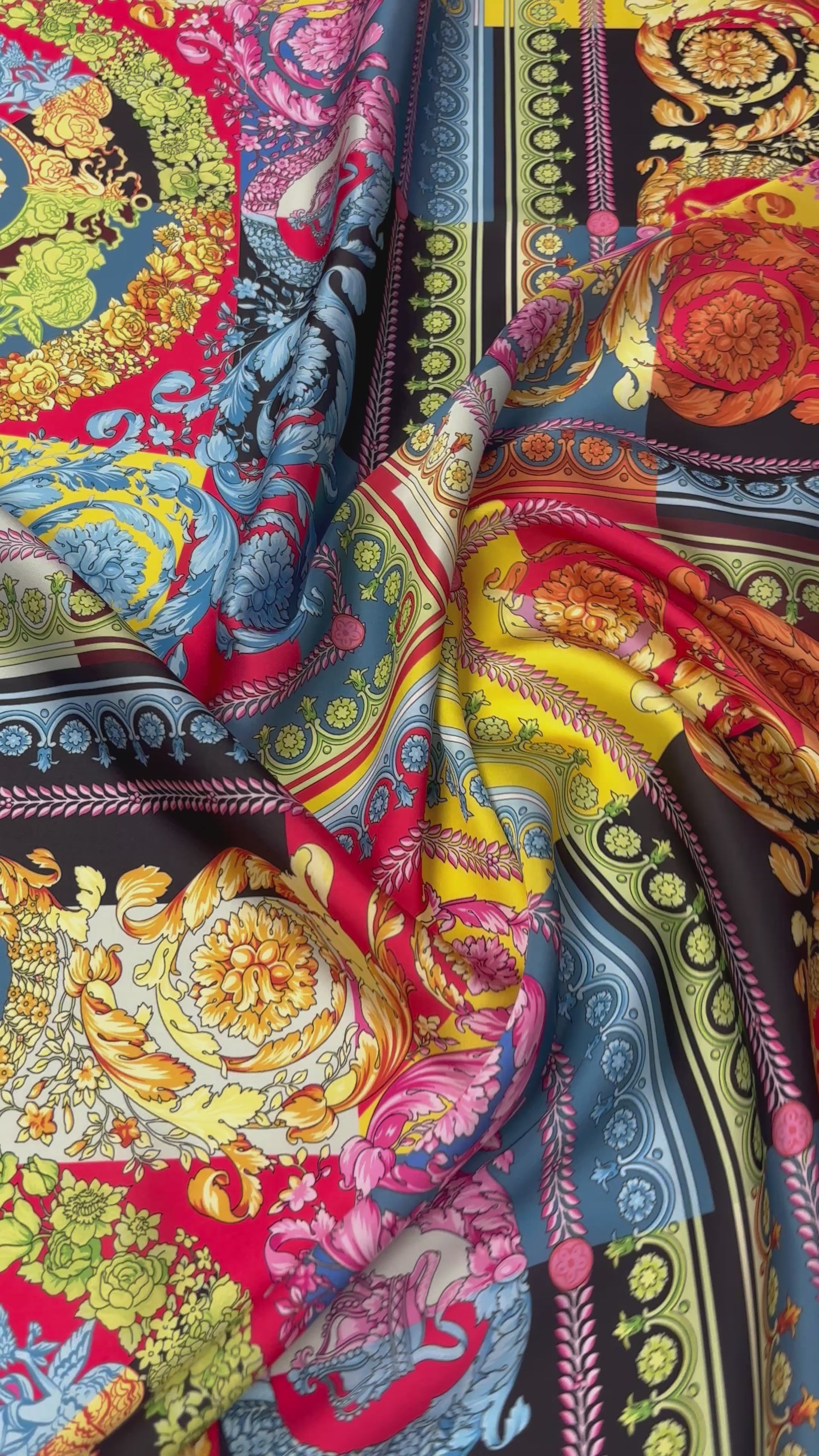 Luxury satin fabric featuring a vibrant baroque patchwork print with rich colours and a silky drape, ideal for dresses, blouses and statement pieces. Sold by the Metre