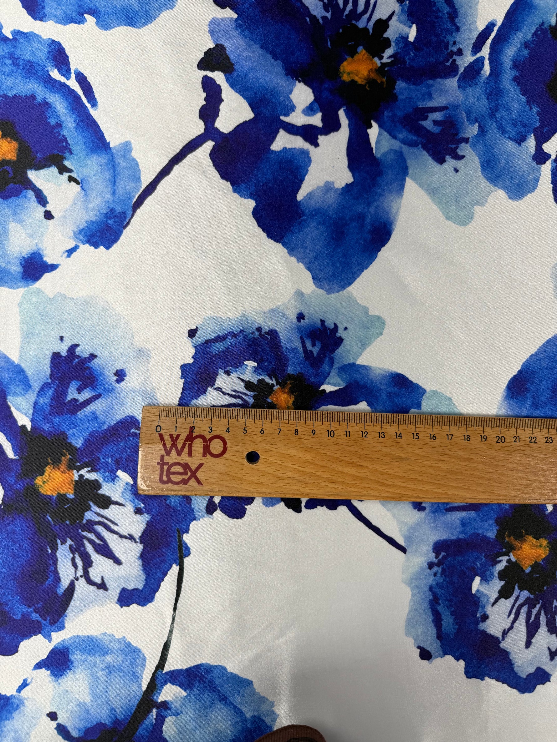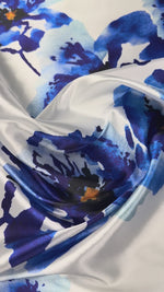 Lycra satin fabric with elegant blue watercolour floral print on a light base. Smooth glossy finish with gentle stretch, ideal for dresses, skirts and statement garments. Fluid drape and refined colour detail. Sold by the Metre.