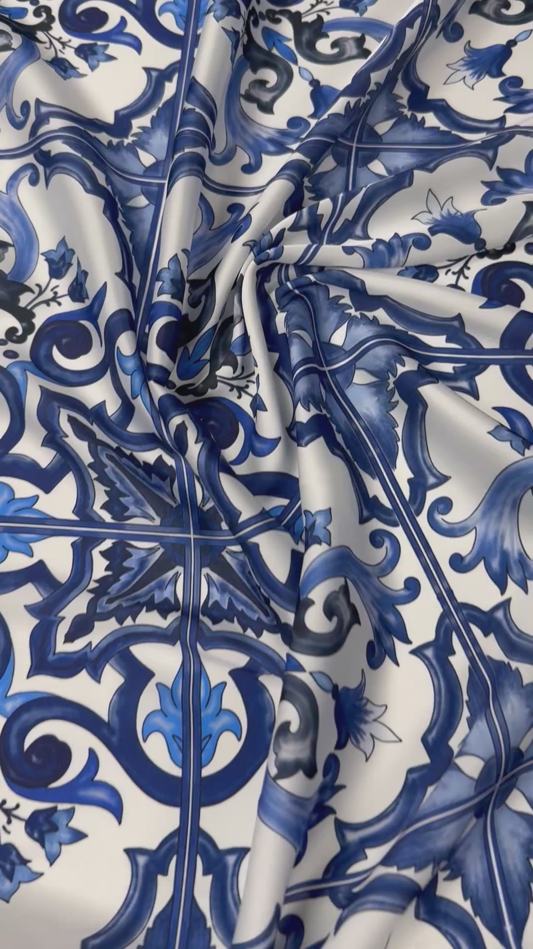 Smooth satin fabric with elegant blue floral pattern on a light base. Ideal for dresses, blouses and refined sewing projects. Soft glossy surface, fluid drape and timeless style. Sold by the Metre.