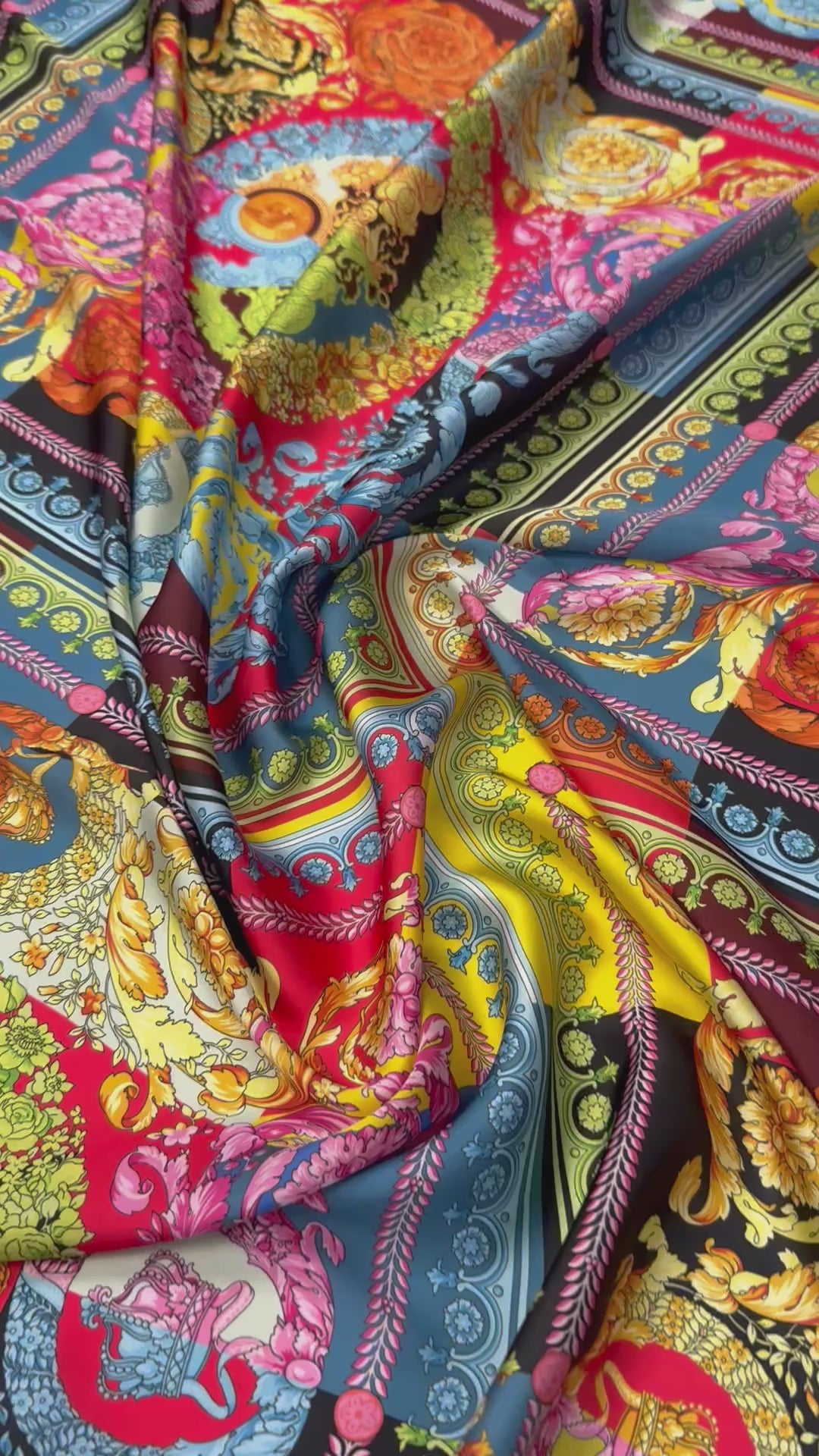 Vibrant satin fabric with ornate baroque patchwork design. Lightweight, fluid drape with soft shine, perfect for dresses, blouses and statement pieces. Sold by the Metre.