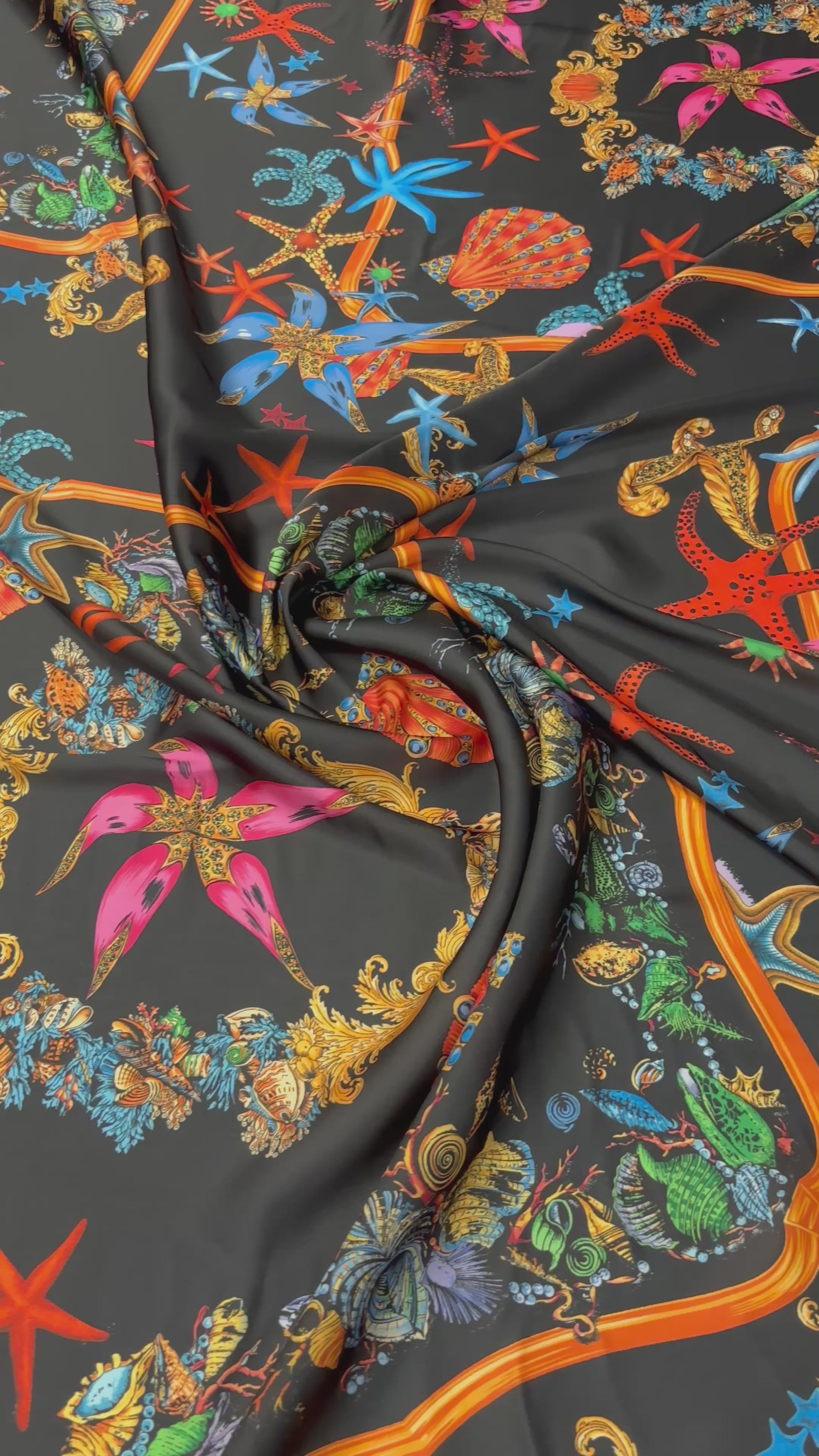 Silky satin with vibrant sea life motifs and a smooth sheen. Perfect for statement dresses, blouses, scarves and luxury fashion pieces. Sold by the Metre.
