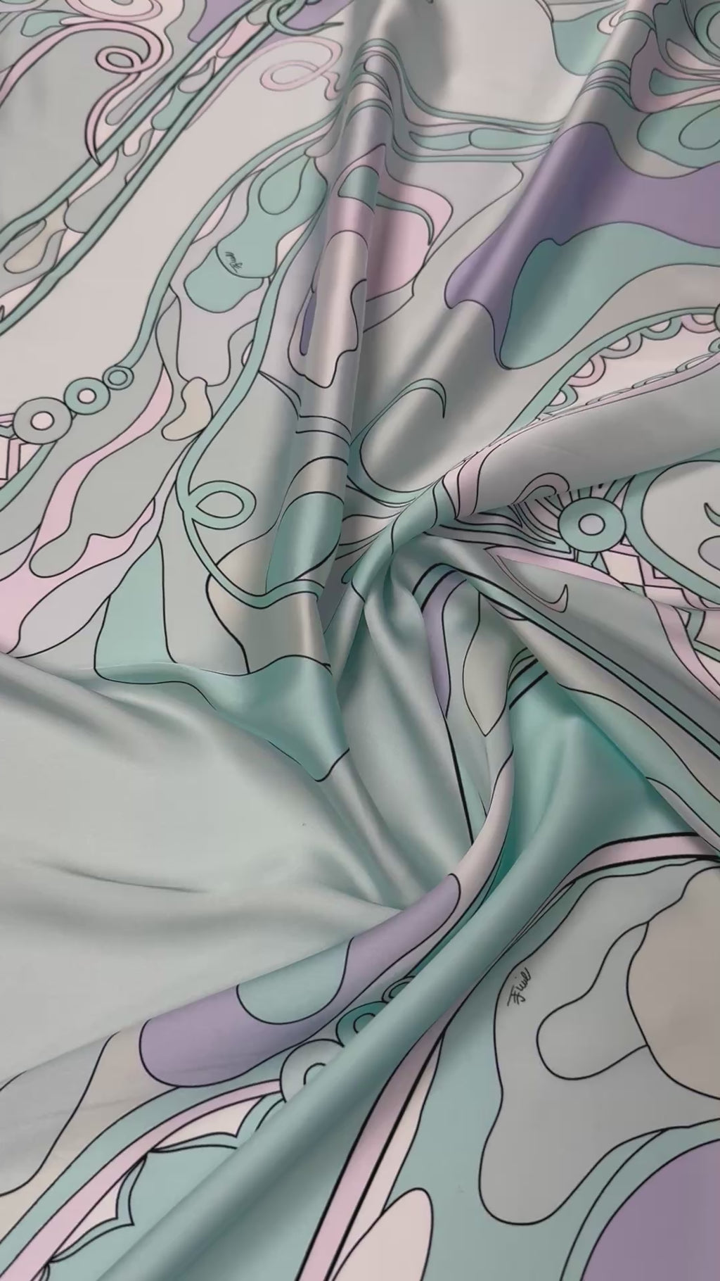 Smooth satin fabric with a pastel swirl and abstract floral pattern, ideal for dresses, blouses, scarves and elegant craft projects. Sold by the Metre.