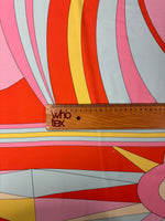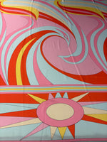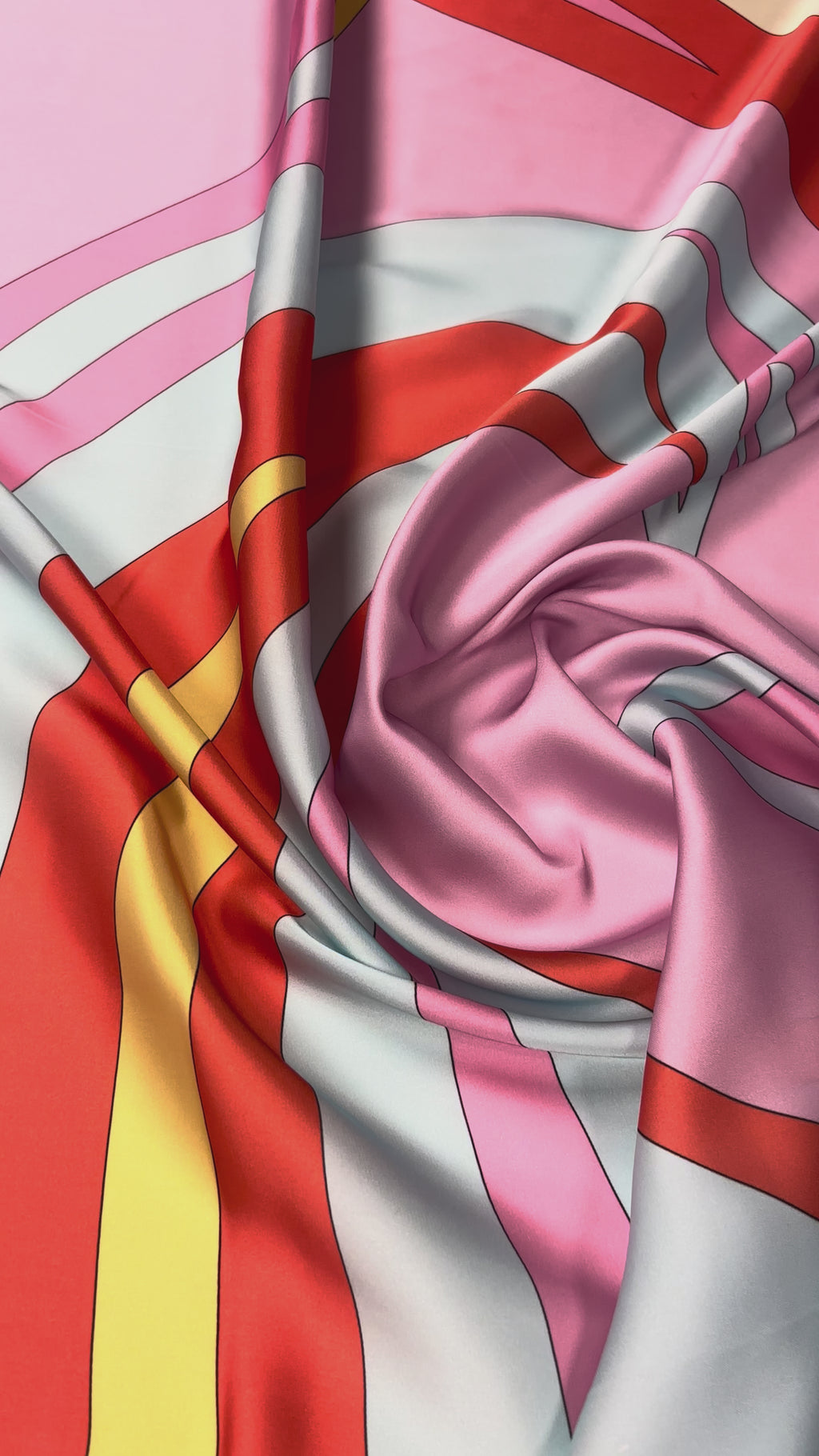 Smooth satin fabric featuring vibrant retro-inspired abstract swirl design. Ideal for dresses, blouses and statement sewing projects. Glossy surface, fluid drape and bold colour impact. Sold by the Metre.