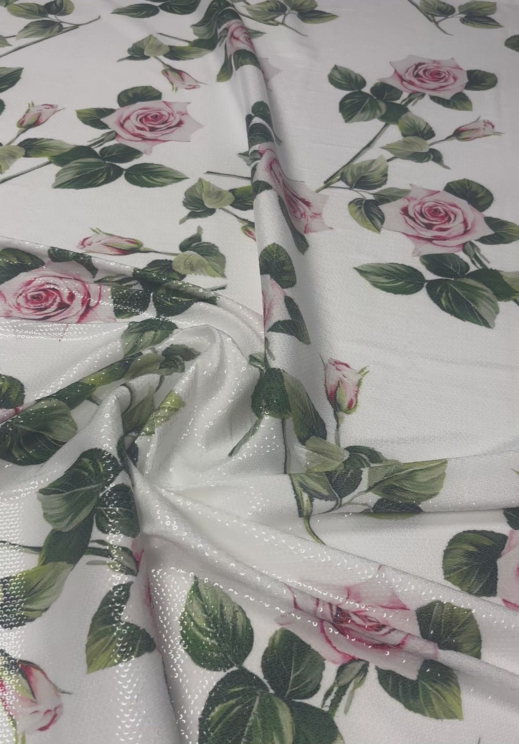 Elegant sequin fabric with a soft rose print and subtle sparkle. Ideal for eveningwear, statement dresses, stage costumes and decorative projects.
