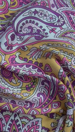 Colourful paisley fabric in pink and yellow tones. Perfect for statement dresses, blouses, and creative sewing projects. Sold by the metre.