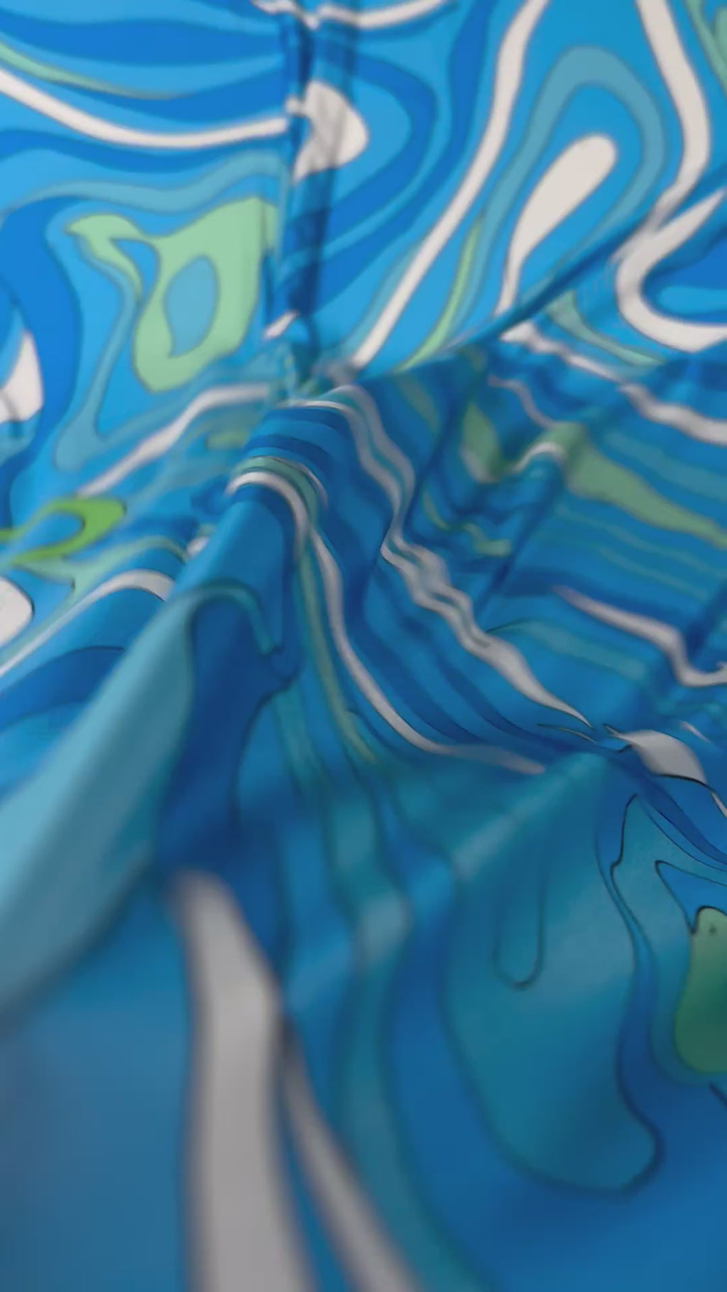 Stretch lycra fabric with flowing wave-inspired abstract pattern in blue and green tones. Ideal for dresses, tops and fitted garments. Smooth handle, comfortable stretch and fluid drape. Sold by the Metre.
