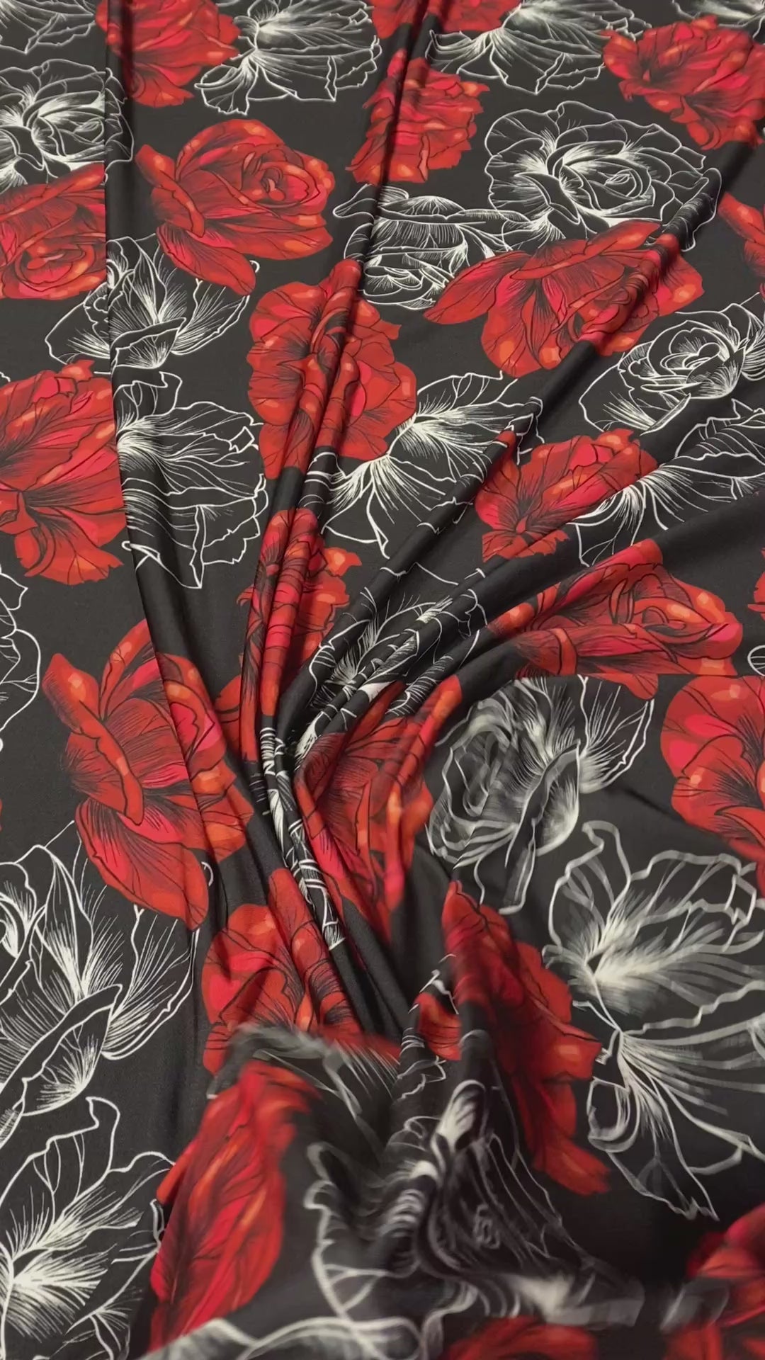 Stretch lycra fabric with striking red rose print on a black base. Ideal for dresses, tops and fitted garments. Smooth feel, comfortable stretch and vibrant floral impact. Sold by the Metre.