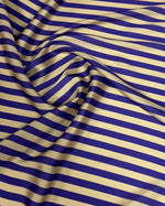 Stylish cream fabric with navy diagonal stripes. Ideal for shirts, dresses, or nautical-inspired home decor projects.