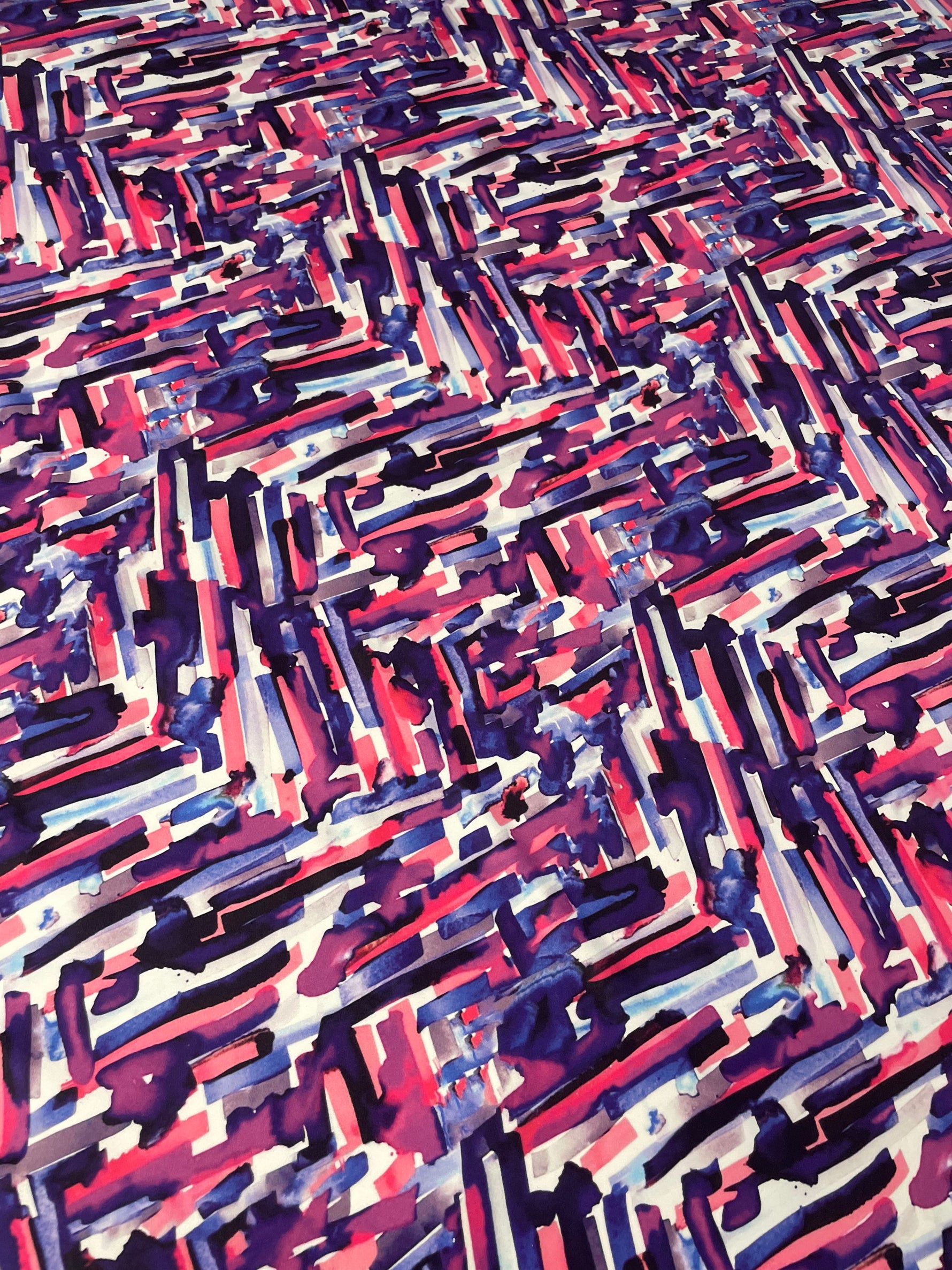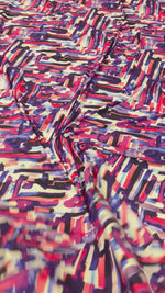 Bold abstract fabric in purple, pink and navy shades. Ideal for dresses, blouses, crafts and statement sewing projects. Sold by the metre.