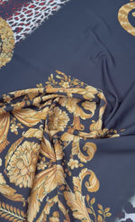 Luxurious baroque crepe fabric with rich gold details on a dark base, offering a smooth touch and elegant drape. Perfect for dresses, blouses, skirts and statement outfits.