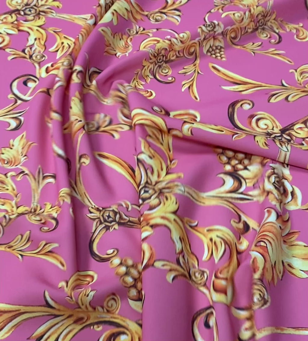 Baroque Floral Crepe Fabric by the Metre – Pink & Gold Luxury Design