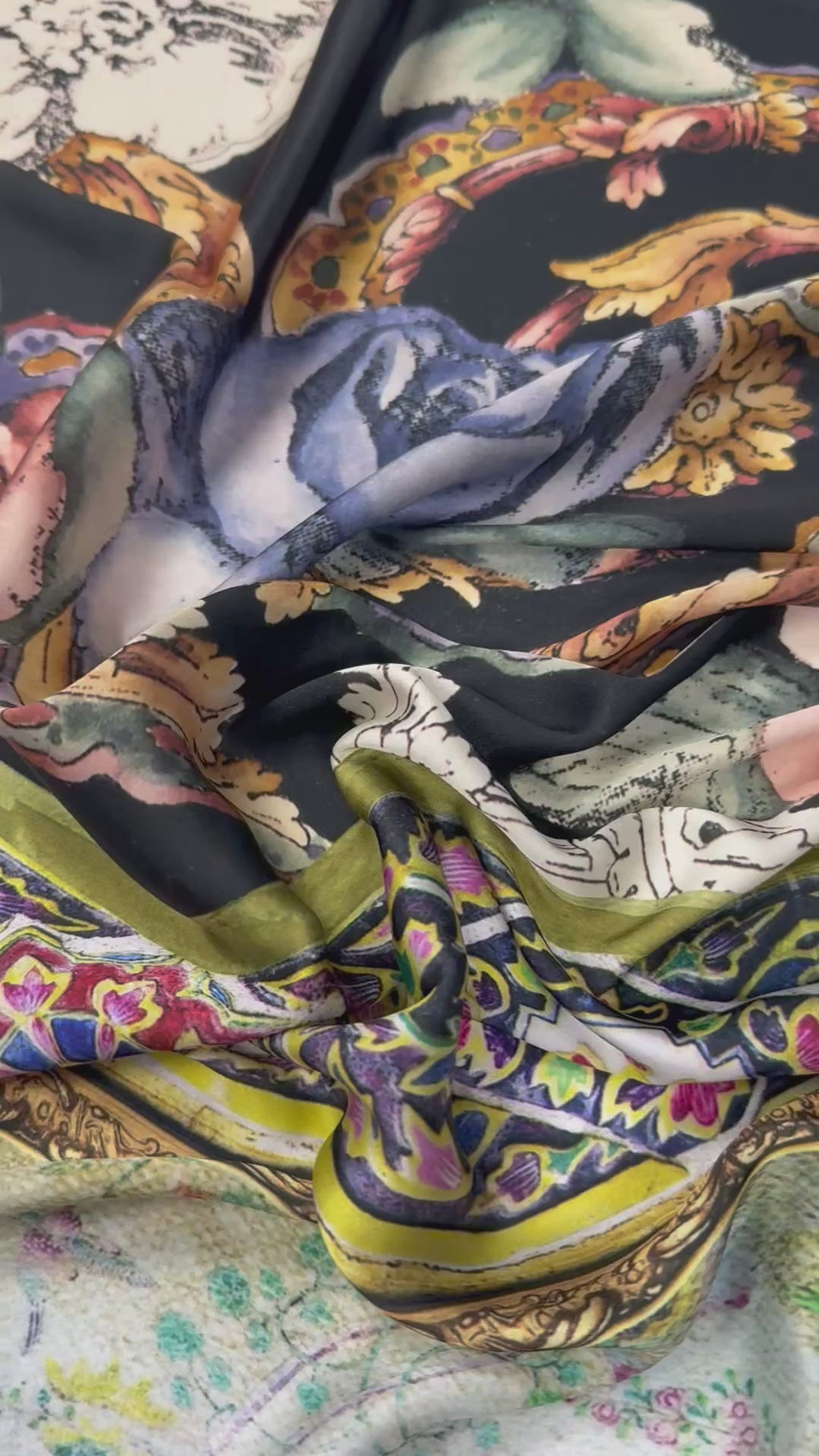 Elegant satin fabric with rich baroque and floral prints, offering a smooth drape and vibrant colours. Perfect for dresses, blouses, skirts and luxury sewing projects. Sold by the metre.