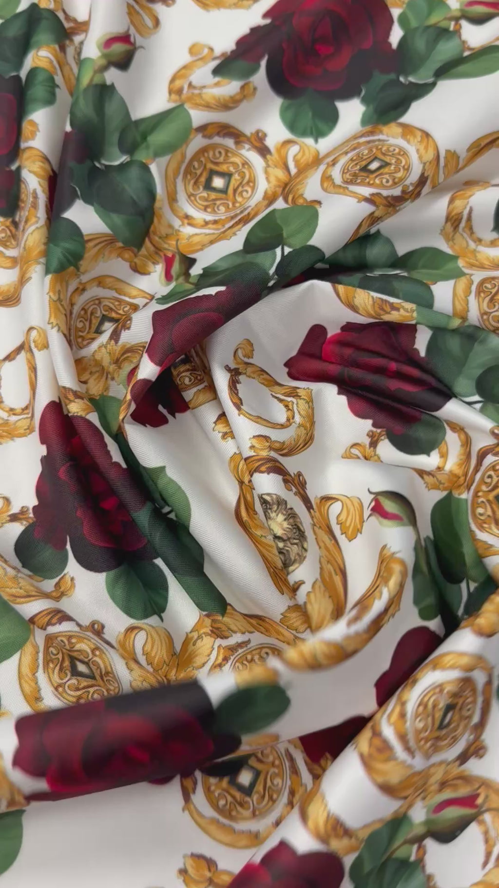 Elegant baroque rose print spandex fabric with smooth stretch and vibrant detail. Ideal for dresses, skirts, tops and stylish craft projects. Sold by the metre.